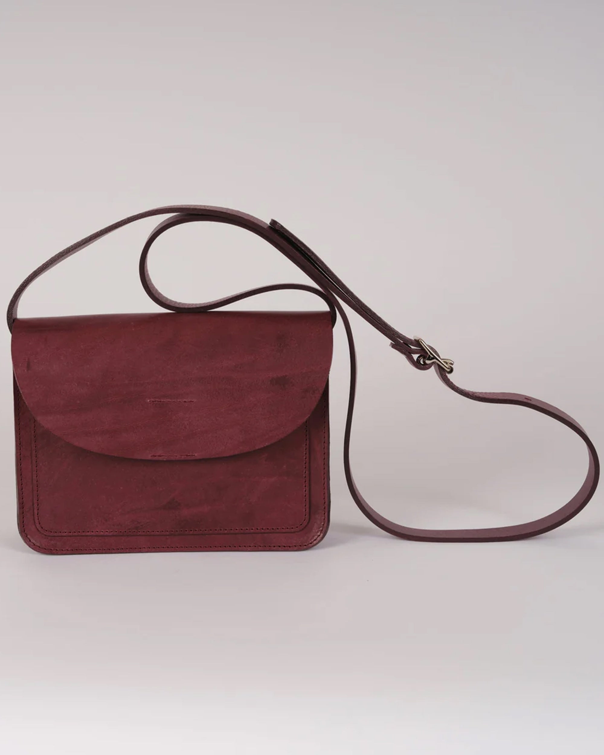 The Hull Bag is a minimal style and features an external front pocket and hidden magnet closure and adjustable leather strap. Made in England from tumbled Italian vegetable tanned leather and Italian brass hardware in silver or brass colour.