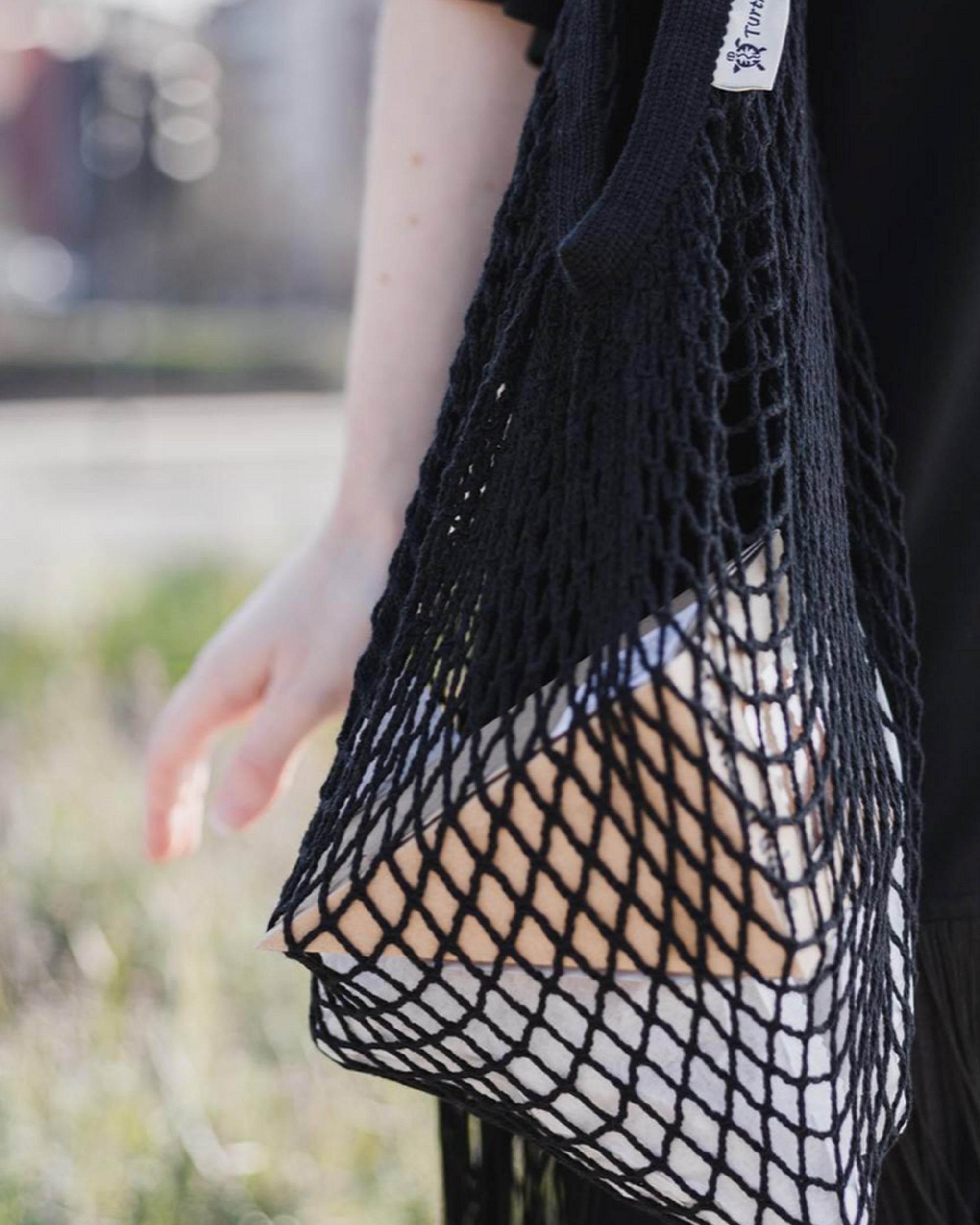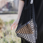 Long Handle Organic Cotton string bags in black dip dye. Certified under the Global Organic Textile Standard (GOTS), which means no chemical pesticides or fertilisers are used in the production of the fabric and farmers must work under safe conditions with an agreed minimum wage. WHICH? tested to hold up to 40kg.