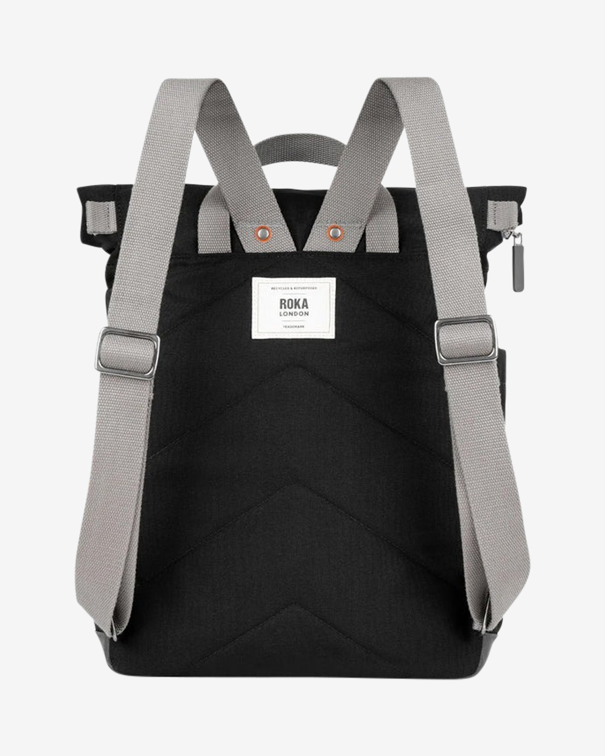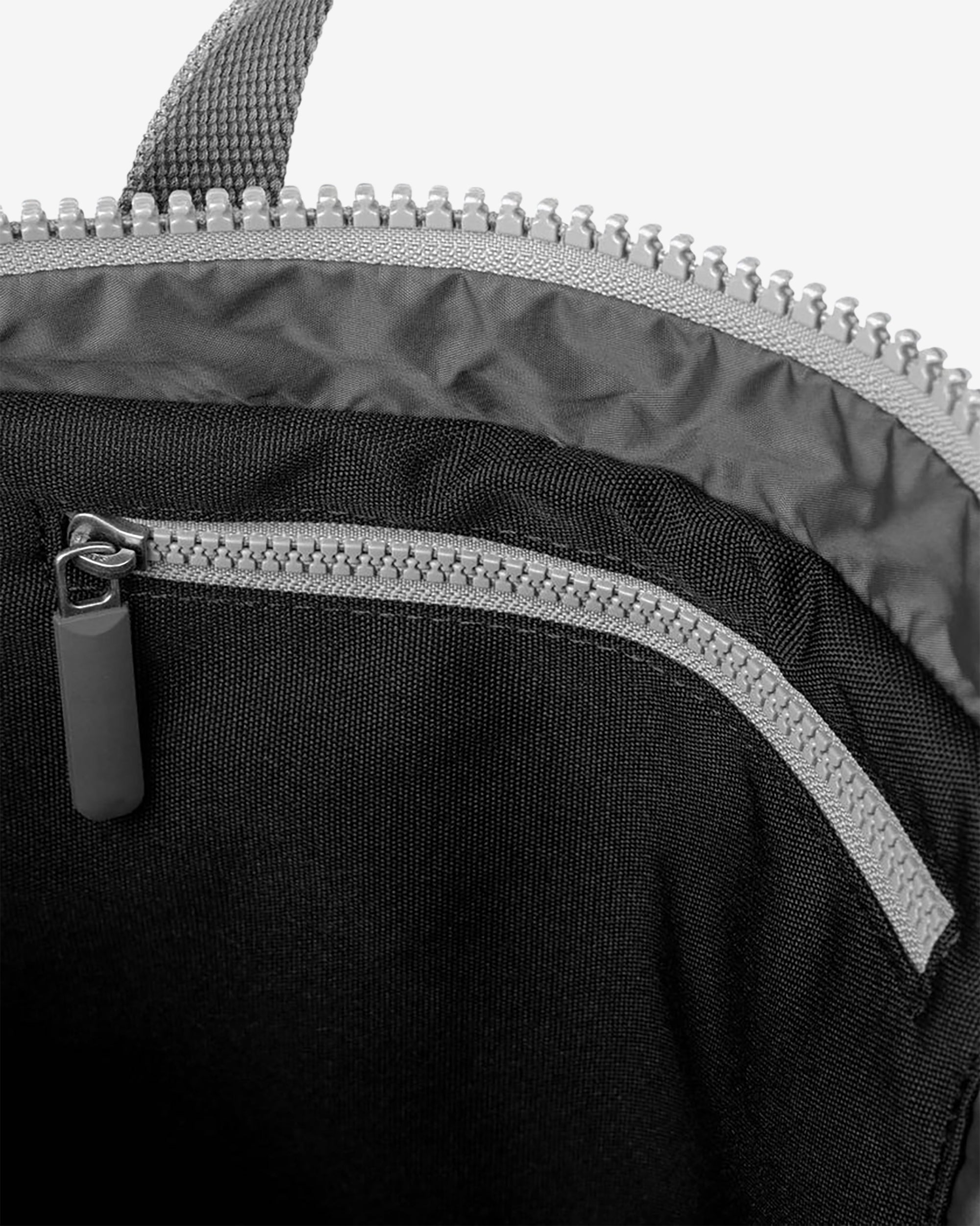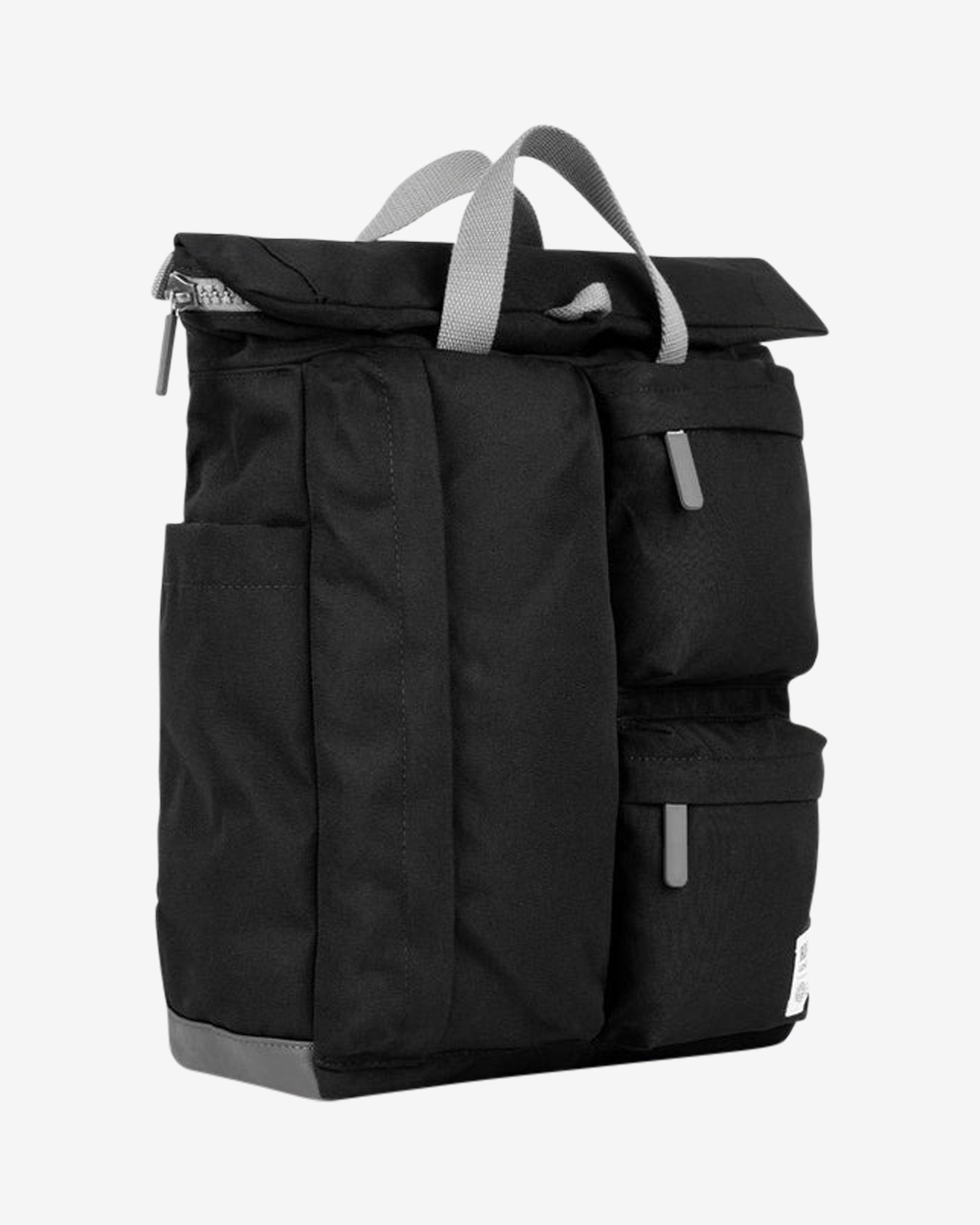 The Roka Waterhouse backpack in ash is roomy, practical and unisex. 3 large external pockets all fastened with zips cover the outside of the rucksack. In collaboration with the natural history museum the Waterhouse is based on the beloved Canfield roll-top backpack.