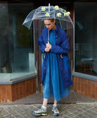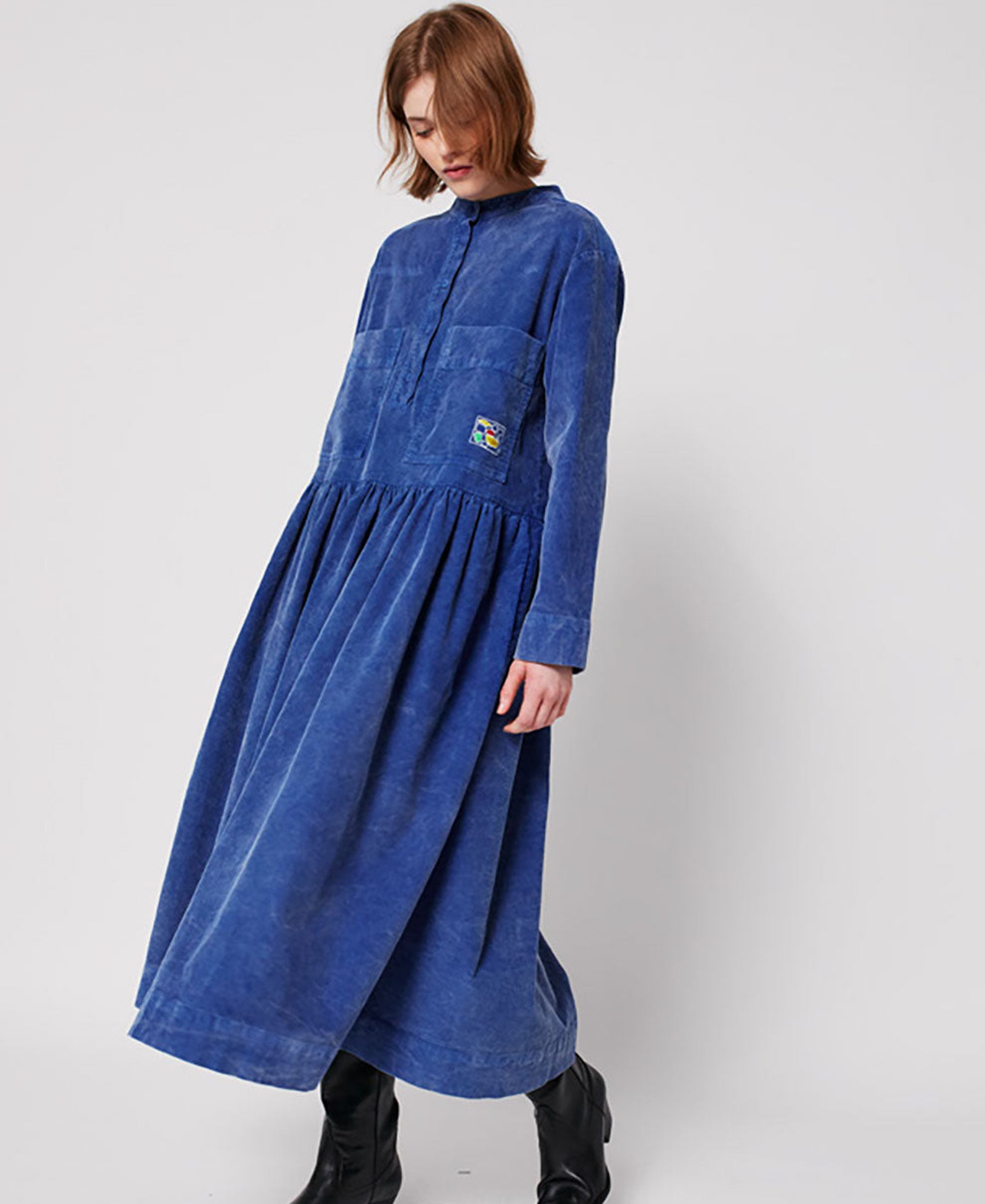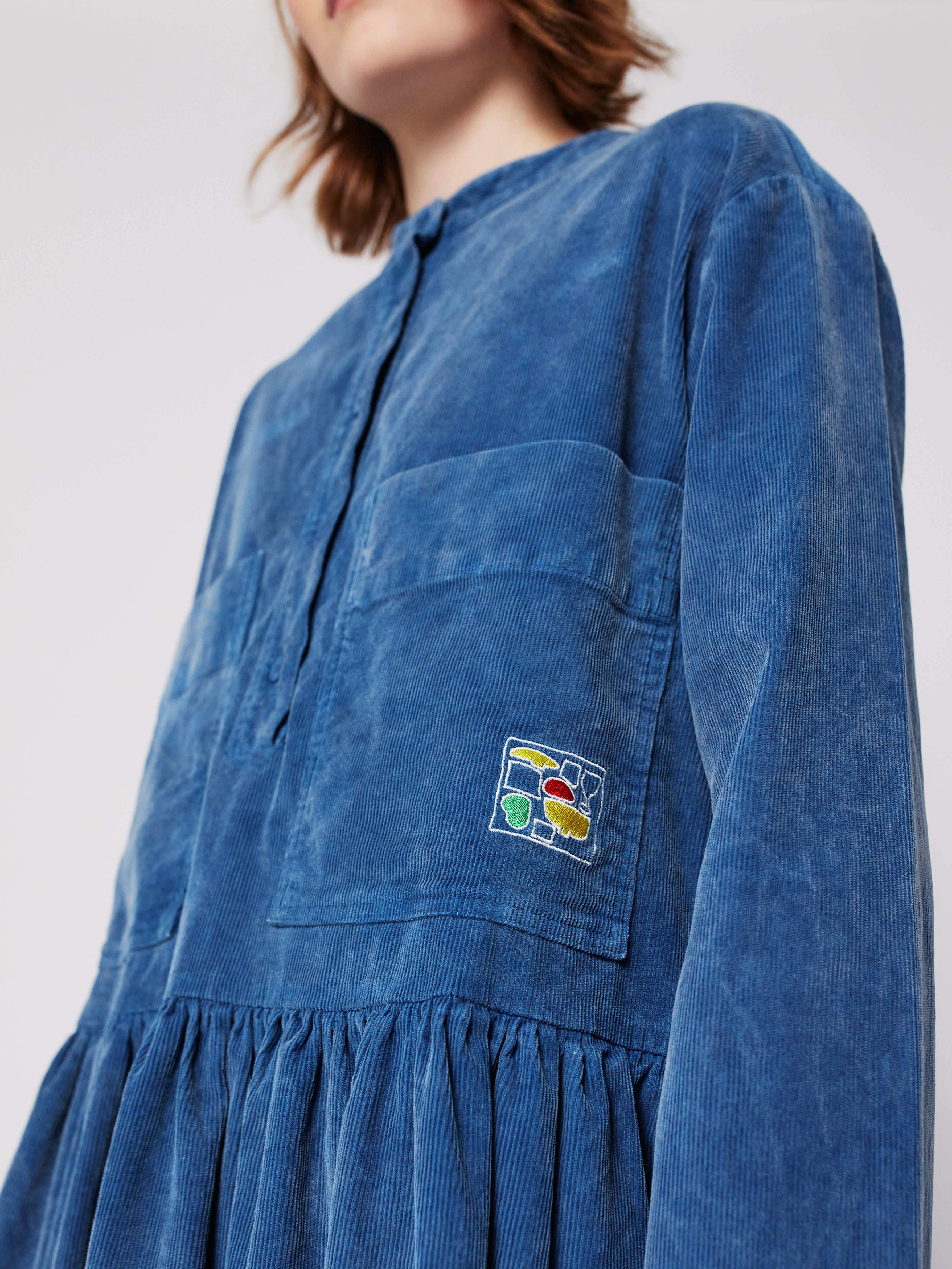 This dress is made from corduroy with a fitted top, perfect for warmth this winter but also easy to wear year-round. The bottom half of the dress is a looser, more relaxed fit. Features a partial button-up front and front pockets.