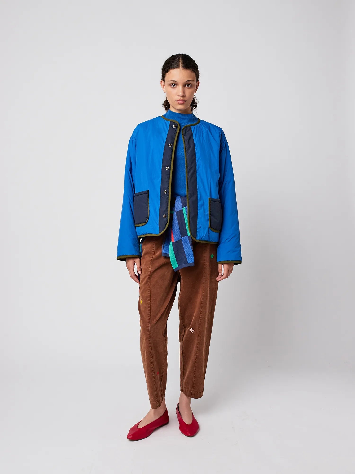 Multicoloured reversible puffer coat by Bobo Choses. This jacket is lightly wadded making it super cosy and malleable. On the one side it's tones of blue and on the other a more khaki green colourway. Designed with slightly loose fit, dropped shoulders and simple popper front opening.