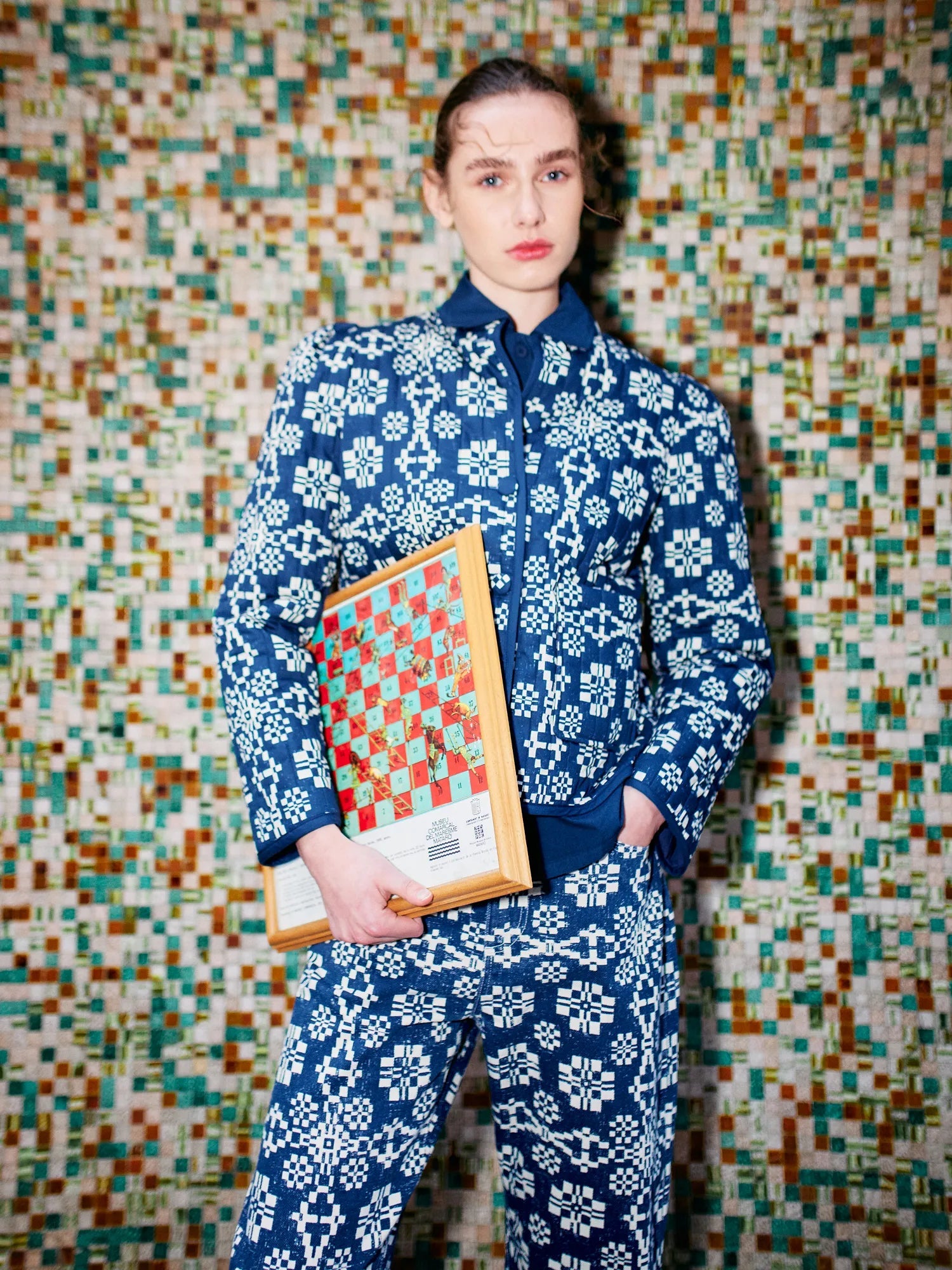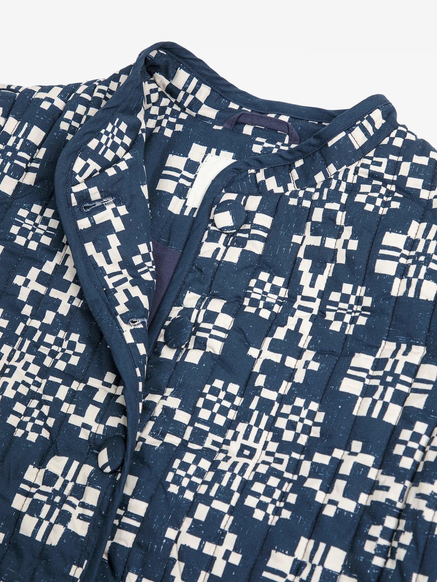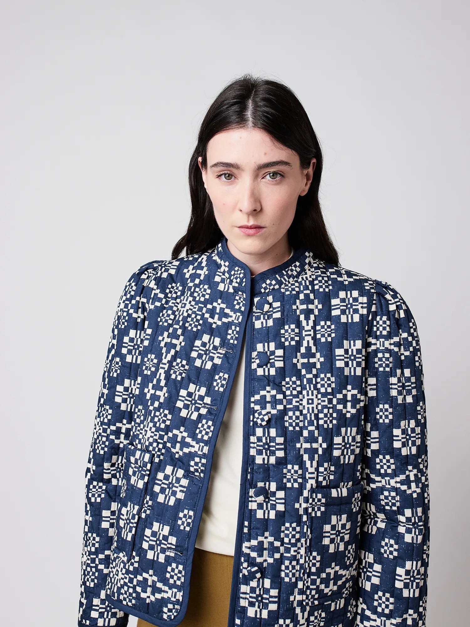 The navy blue kaleidoscope quilted jacket is the perfect transitional piece. With a cropped fit this jacket has puffed sleeves and patch pockets. The all over print is in navy and white and features hand drawn geometric welsh blanket style patterns. The medium weight wadding is perfectly cosy.