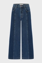 FEATURES: Super high-rise, super wide leg, 5 pocket jean, two tone denim, rigid denim, midweight fabric, short length.