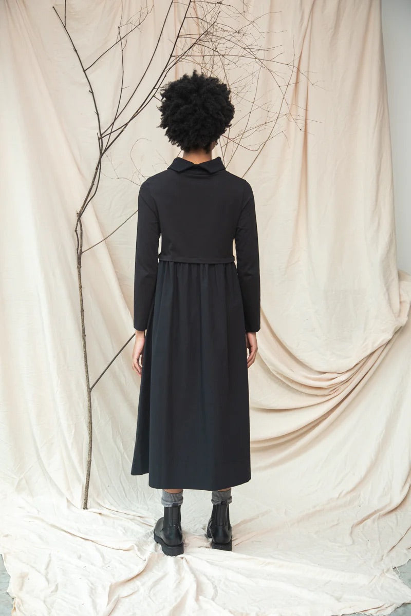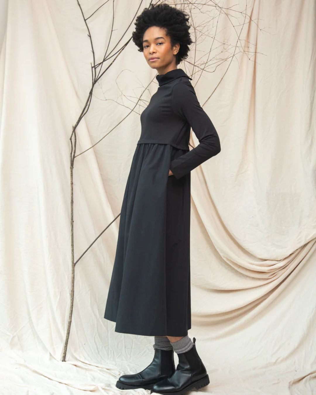 The Birch by Beaumont Organic is crafted in organic cotton with a jersey top and poplin skirt, featuring a roll neck and reverse split feature. The top is slightly fitted with full length sleeves. An empire line gathered waist and full skirt create a beautiful silhouette.