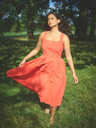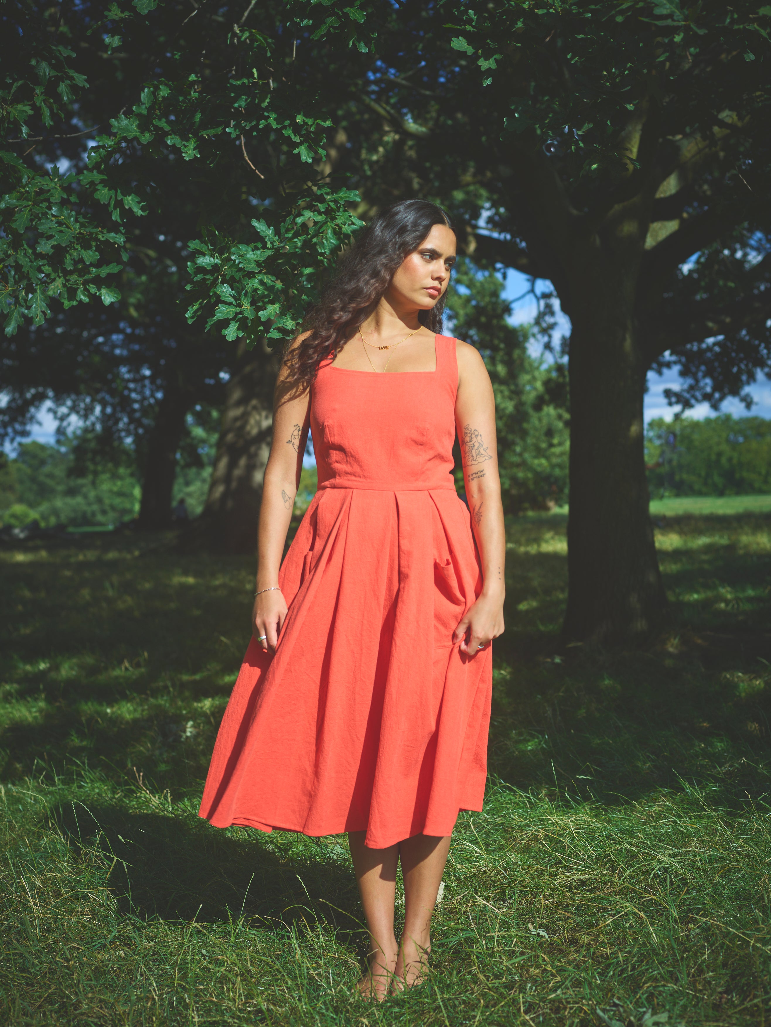 A Lowie retro classic. The lace back dress has criss cross lacing pulling the piece in at the waist. Box pleats give this dress it's 1950's styling not to mention very practical side pockets and a little bit of elastic at the back to ensure the perfect fit. A flattering sundress style with a fitted, lined bodice and wide straps.