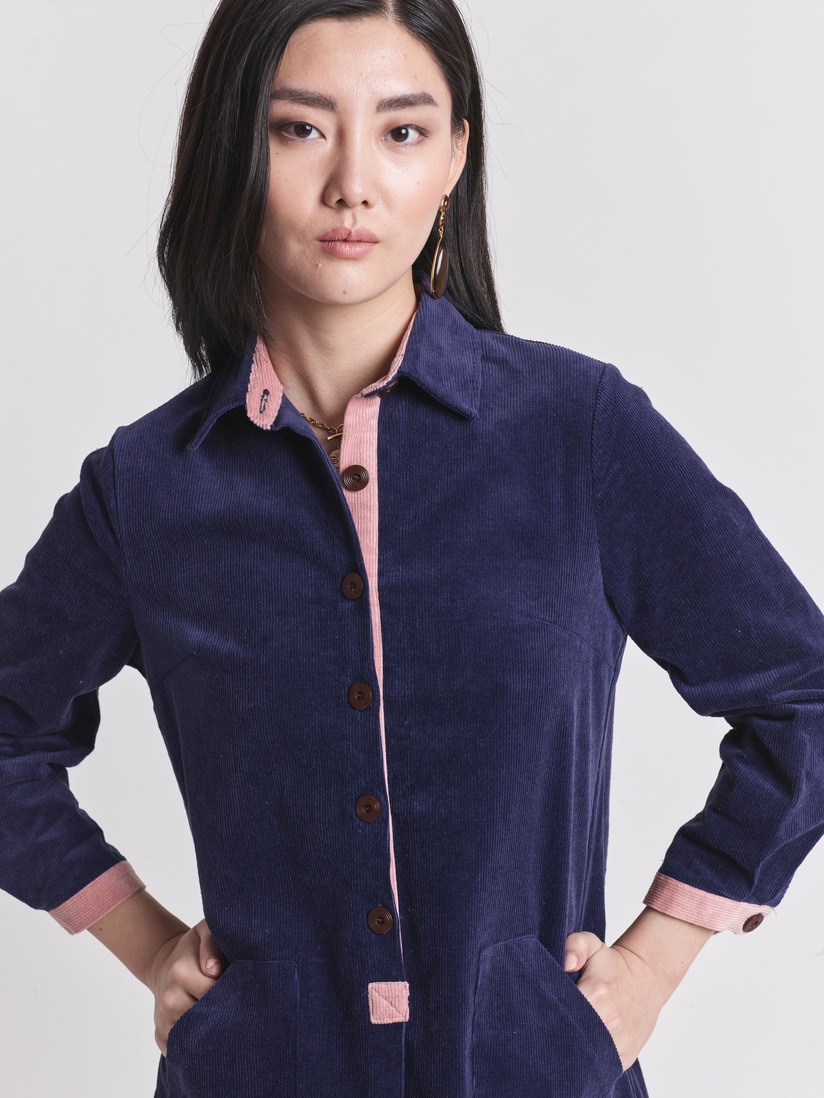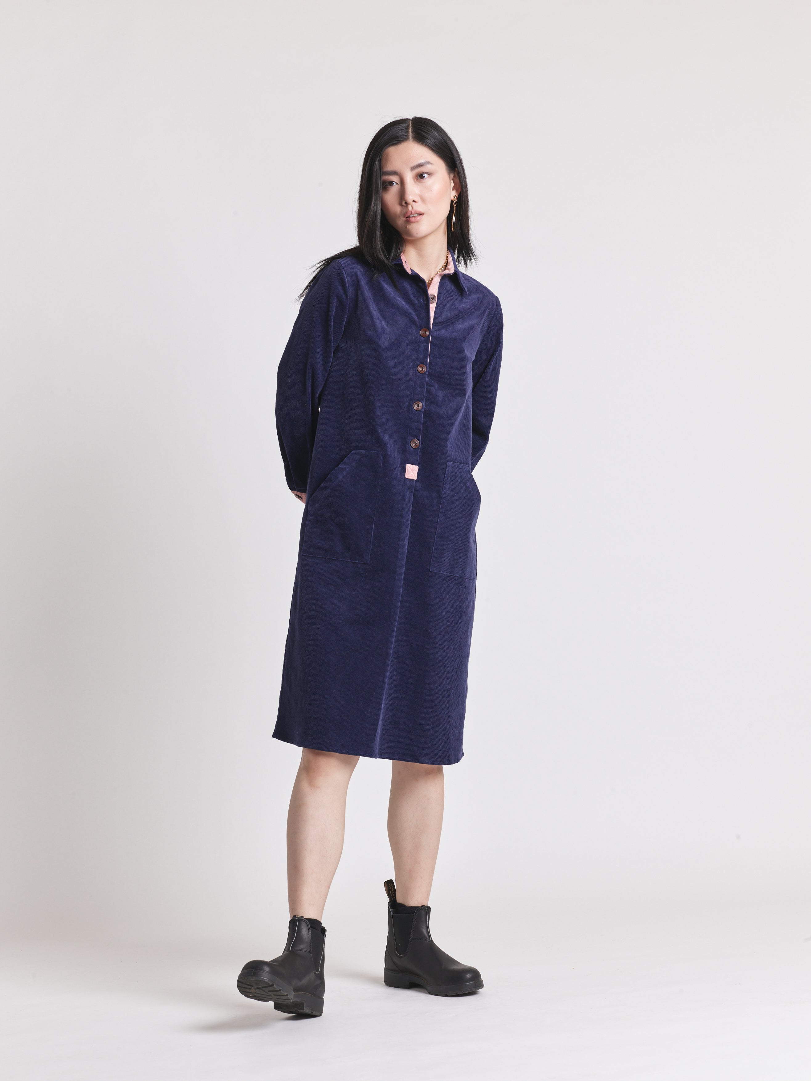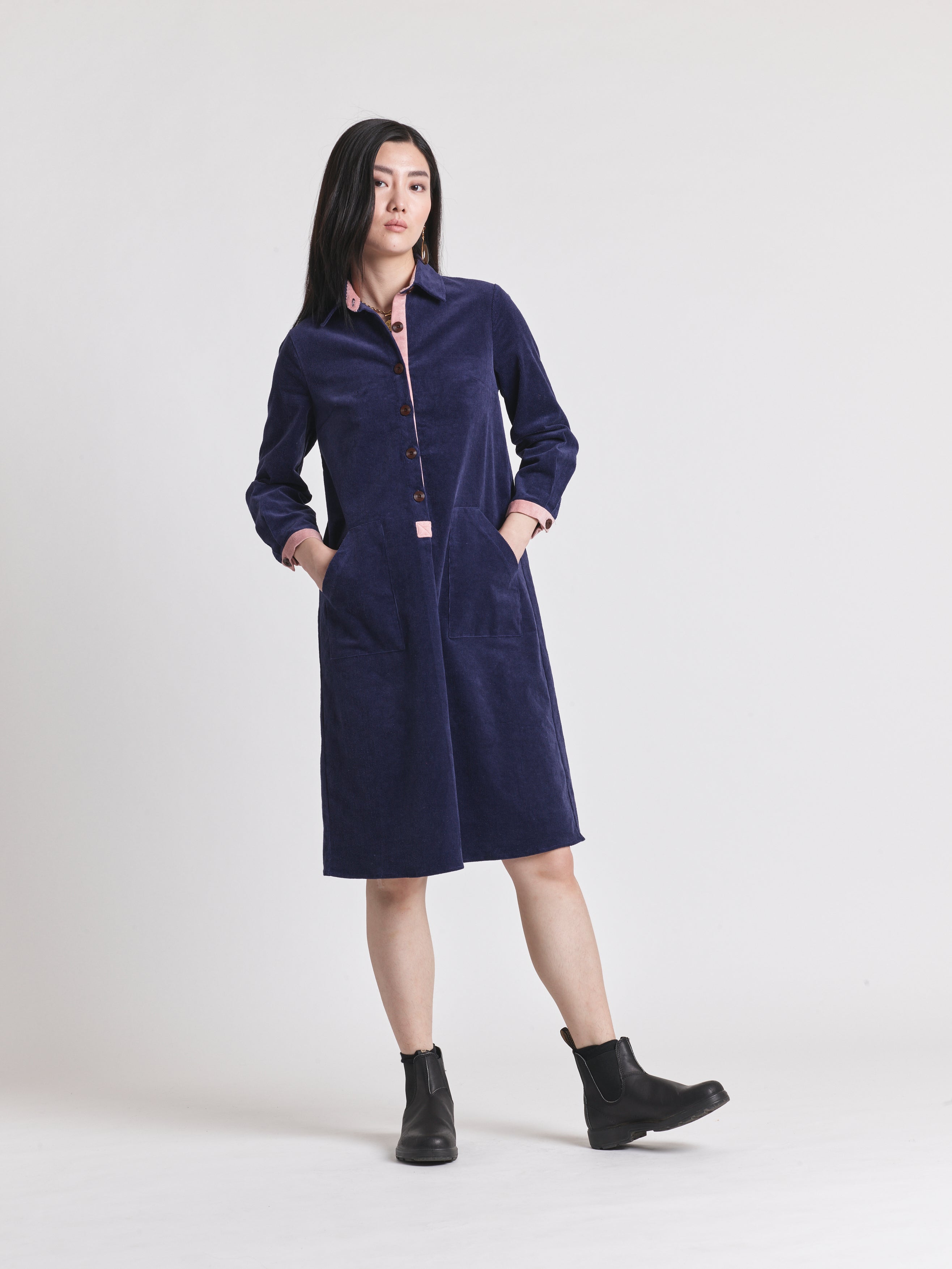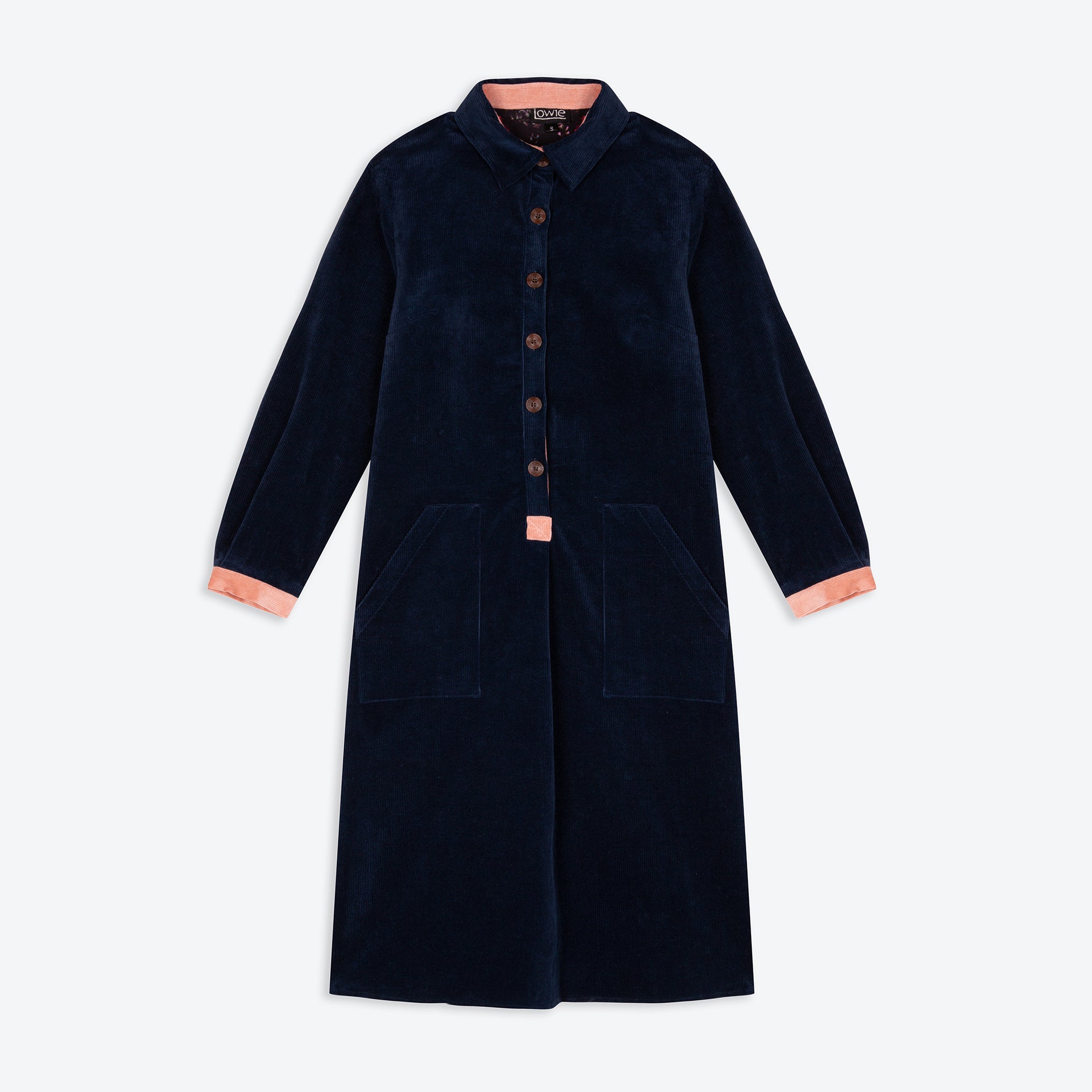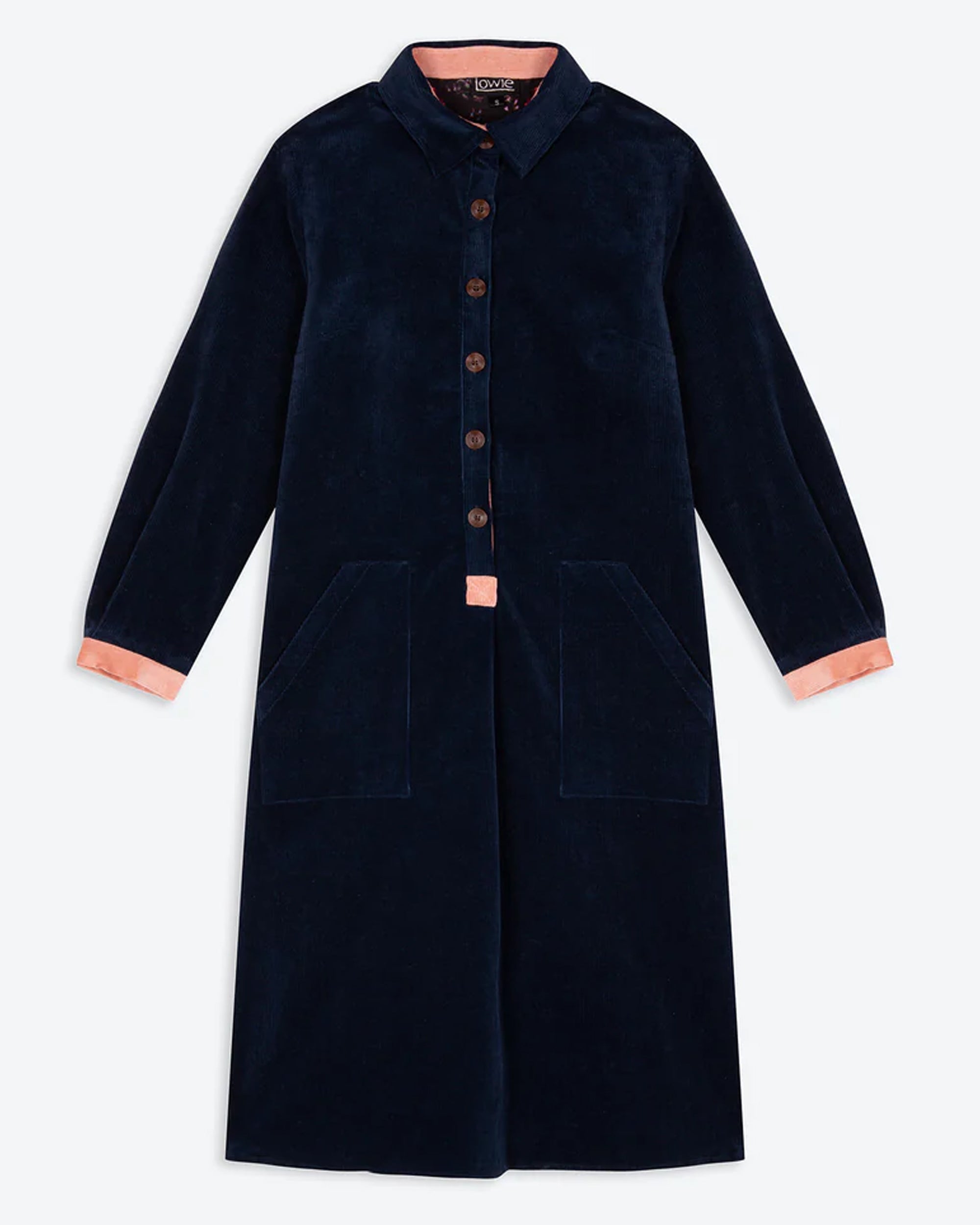 Our classic corduroy shirt dress in navy is a wardrobe staple. Crafted from 100% cotton, this dress reflects Lowie’s fusion of traditional and contemporary style. It’s cut to a straight fit with asymmetrical front pockets, falling to a mid-length hemline and accented with pink corduroy detail. Full length sleeves, button down front placket, and wooden button cuffs complete the piece. Accompany it with tights and boots for everyday appeal.