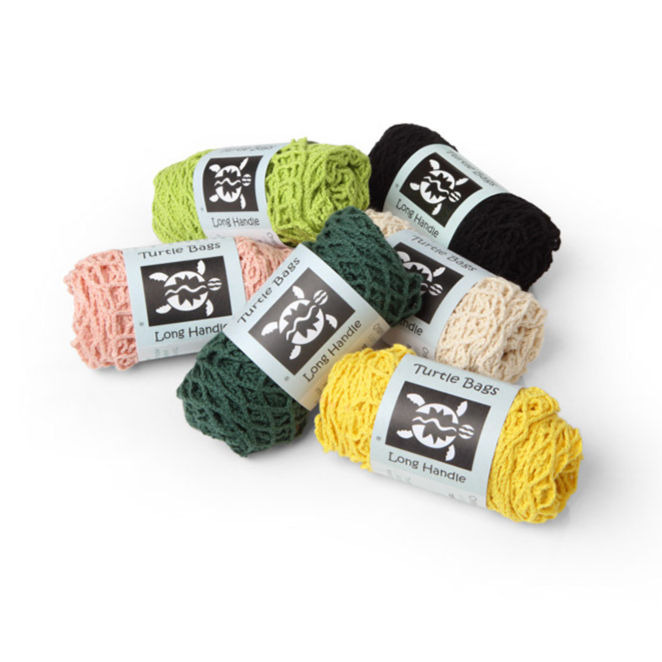 Long Handle Organic Cotton string bags in black dip dye. Certified under the Global Organic Textile Standard (GOTS), which means no chemical pesticides or fertilisers are used in the production of the fabric and farmers must work under safe conditions with an agreed minimum wage. WHICH? tested to hold up to 40kg.