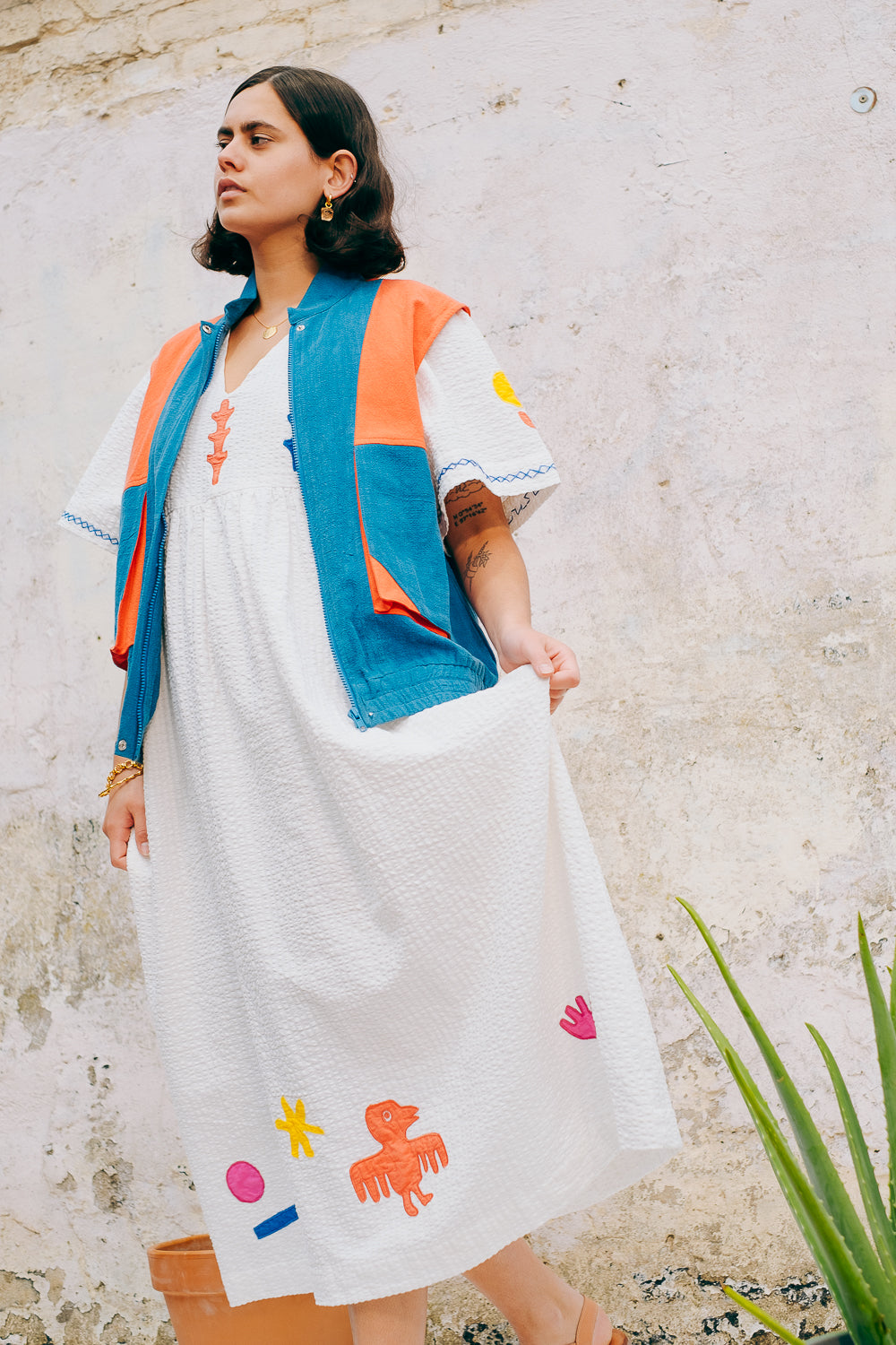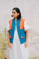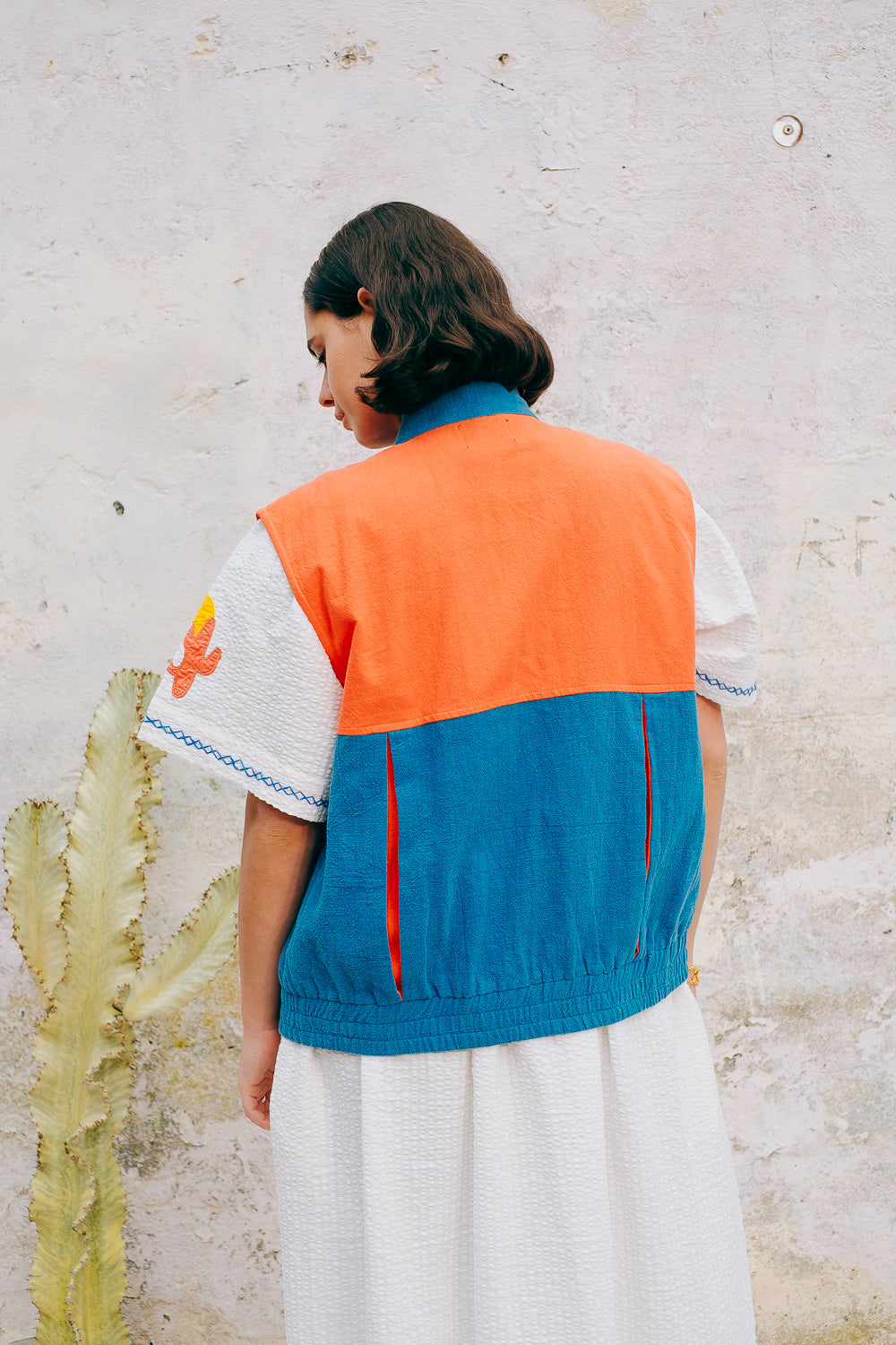 This two tone gilet is a great statement piece for your wardrobe this Spring/ Summer. Taking inspiration from 80's sportswear our sleeveless bomber jacket has deep side pockets with contrast panelling, poppers and a front zip. Throw over a boilersuit or jumper when you need extra pockets or a bit more warmth.
