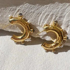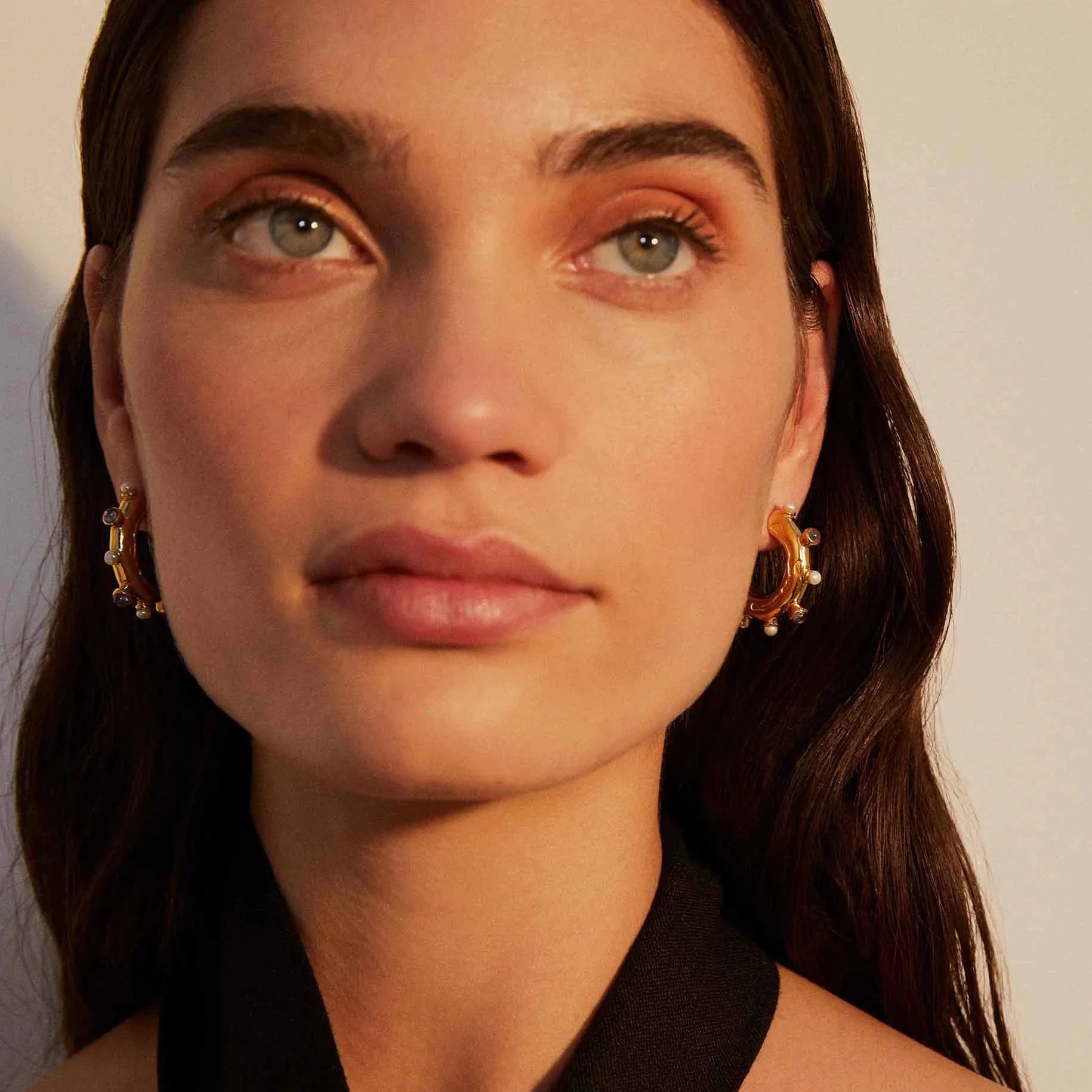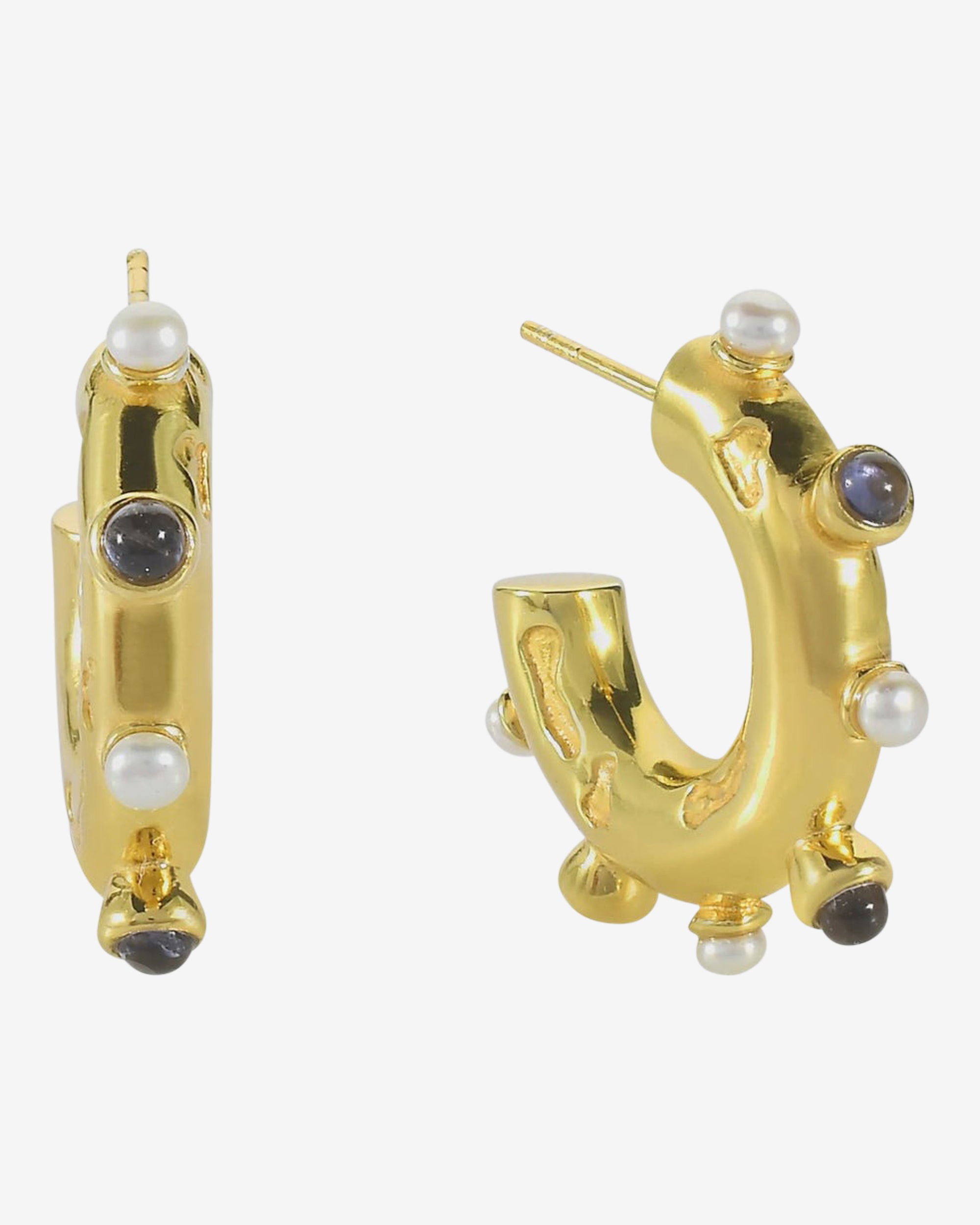 The Malie Earrings are chunky handmade hoops, adorned with beautiful tiny pearls and iolite coloured glass stones which contrast with the rich gold tones.