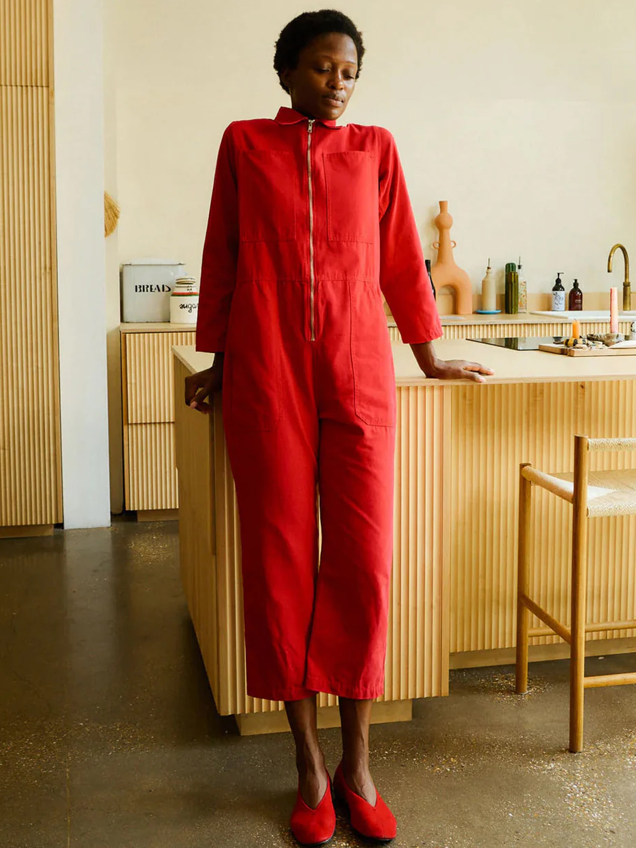 The Dominic Boilersuit has a relaxed fit and a slightly tapered leg, with 3/4 length sleeves. In a vibrant spice red non-stretch cotton canvas, with large utility style pockets and a silver front zip.
