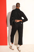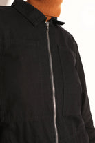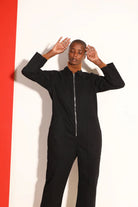 The Dominic Boilersuit by L F Markey has a relaxed fit and a slightly tapered leg, with 3/4 length sleeves. In a classic black non-stretch cotton canvas, with large utility style pockets and a silver front zip.