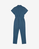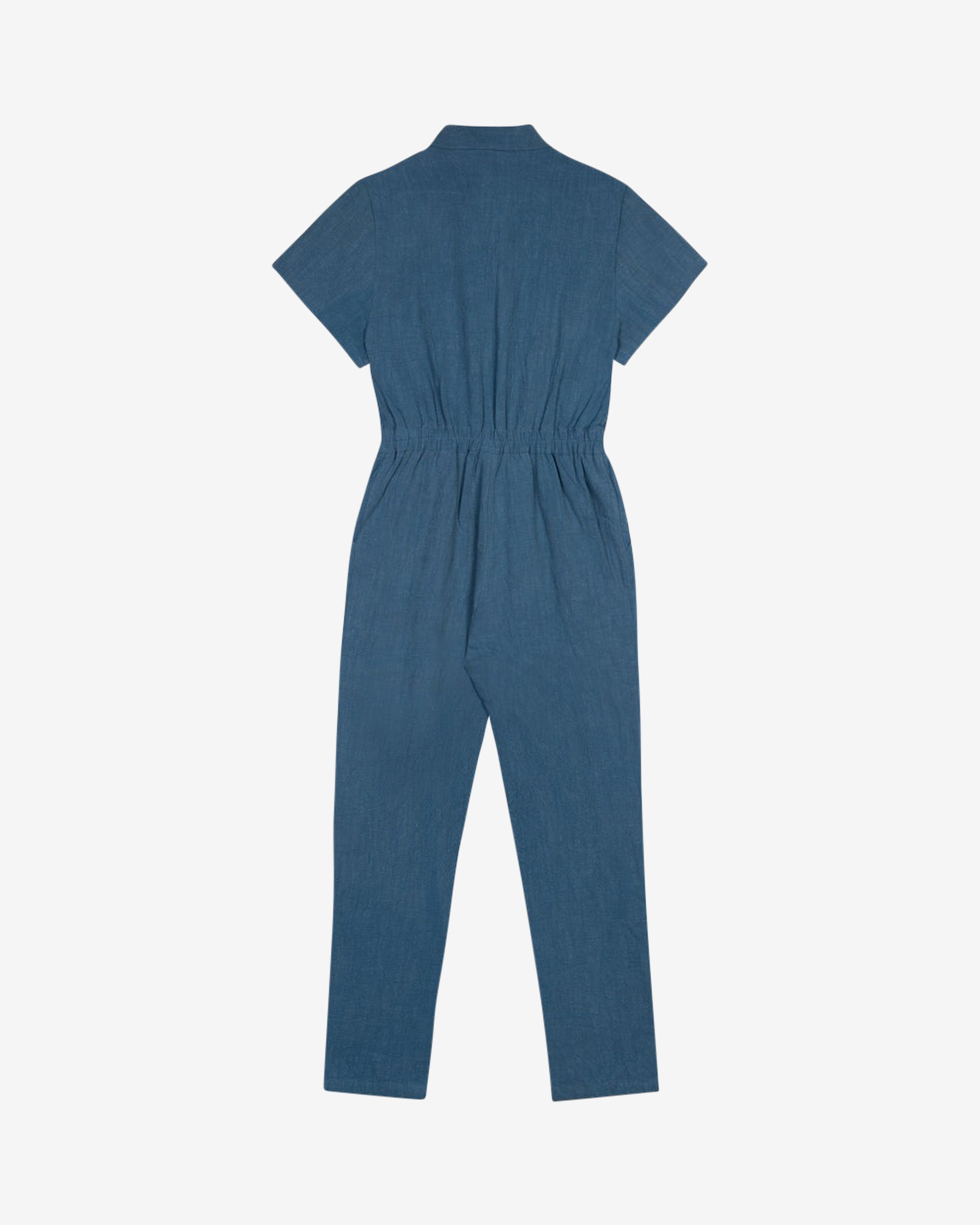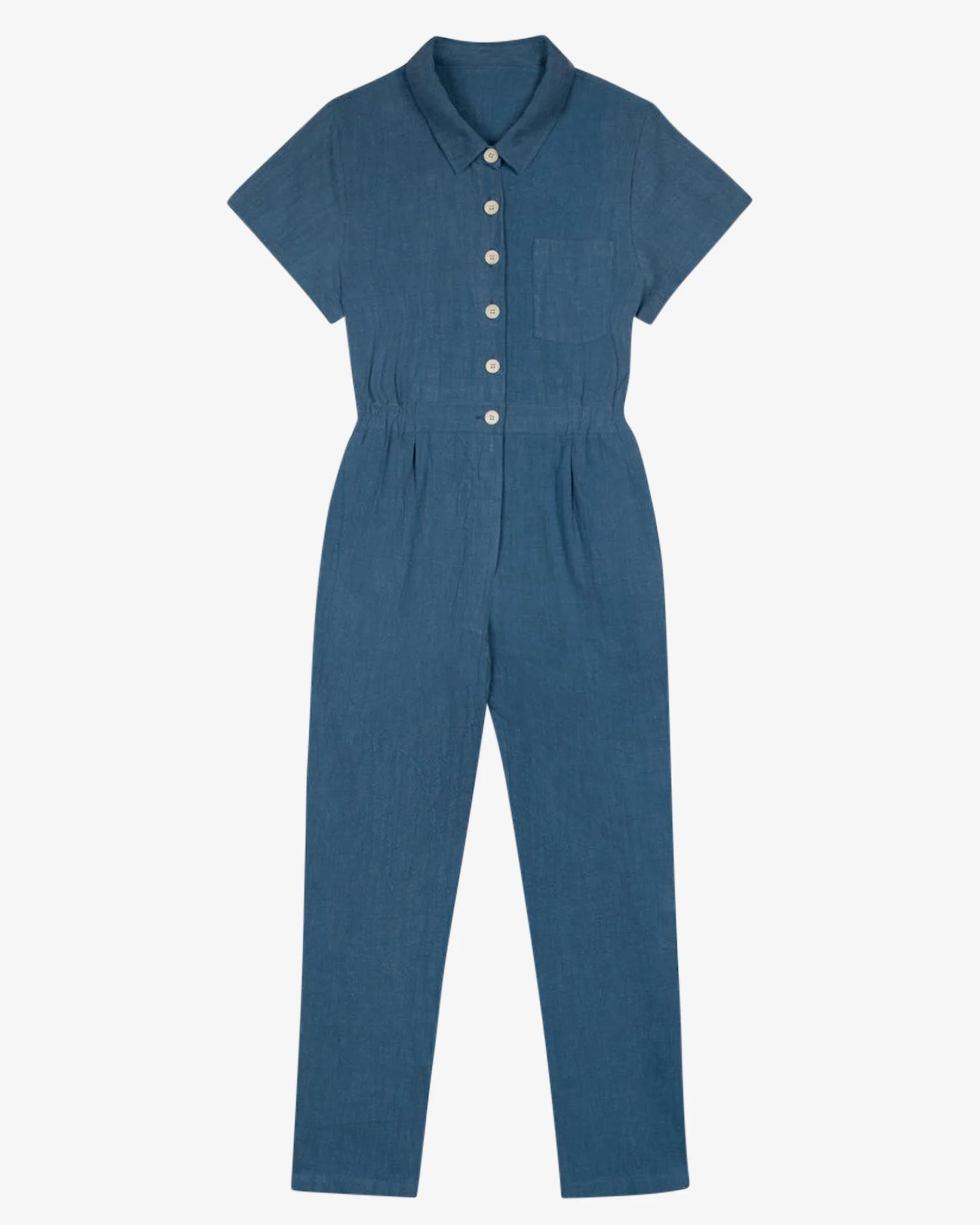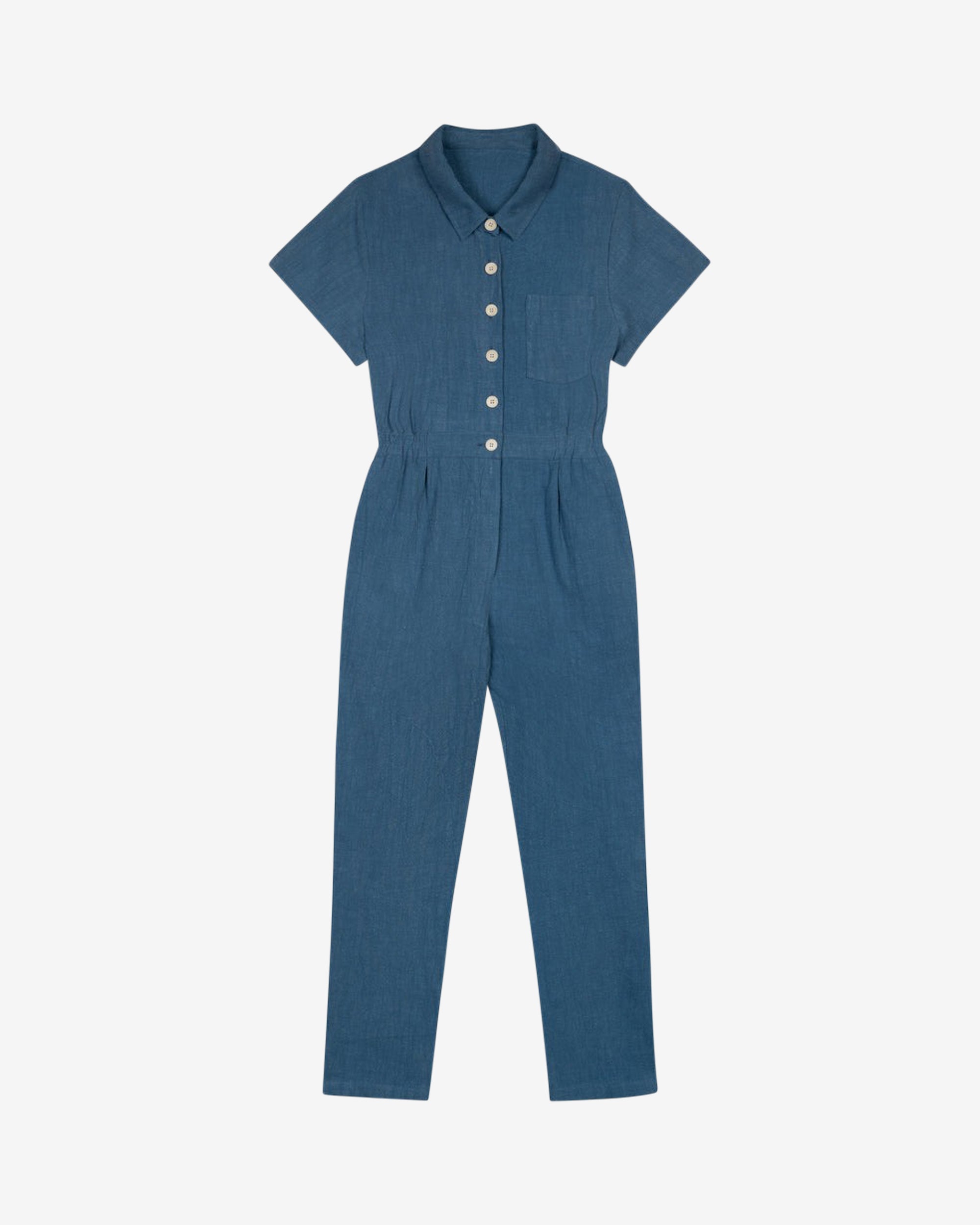 Our tried and tested classic short sleeved summer boilersuit is back in a washed blue. This jumpsuit is a relaxed style, with front button opening to the zip and a three quarter elastic waist with front pleats for a flattering fit. The eco friendly corozo nut buttons are made in the Cotswolds in a small factory dedicated to bringing back UK button making. Patch pocket at the top and roomy side pockets in the trousers. These overalls are the perfect summer staple for your wardrobe.