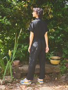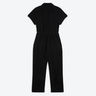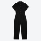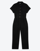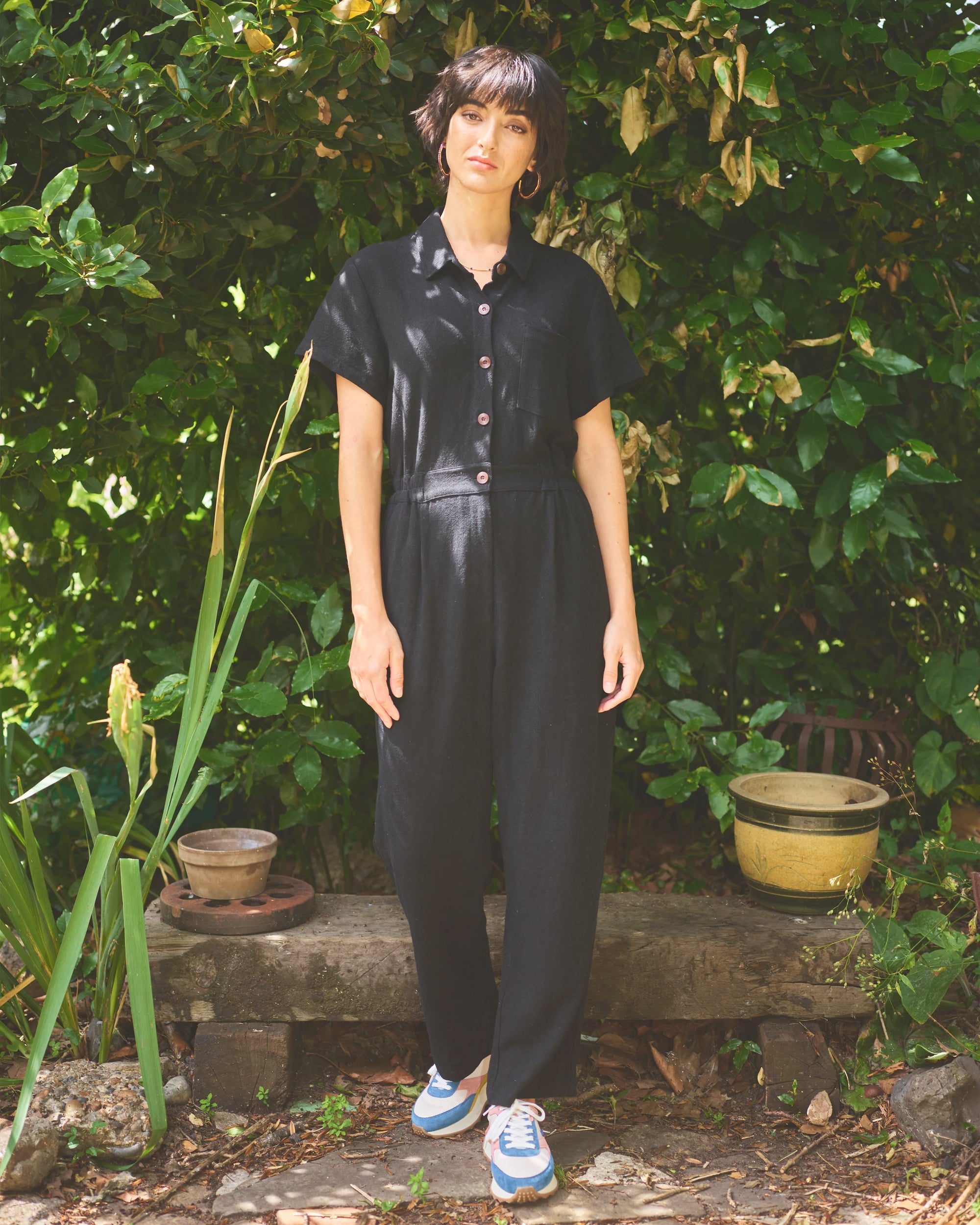 Crafted from fluid linen viscose, this classic black jumpsuit features short sleeves, point collar, front button placket and side pockets. A flattering elasticated waistband gives definition by cinching in the waist before falling to tapered ankle length.