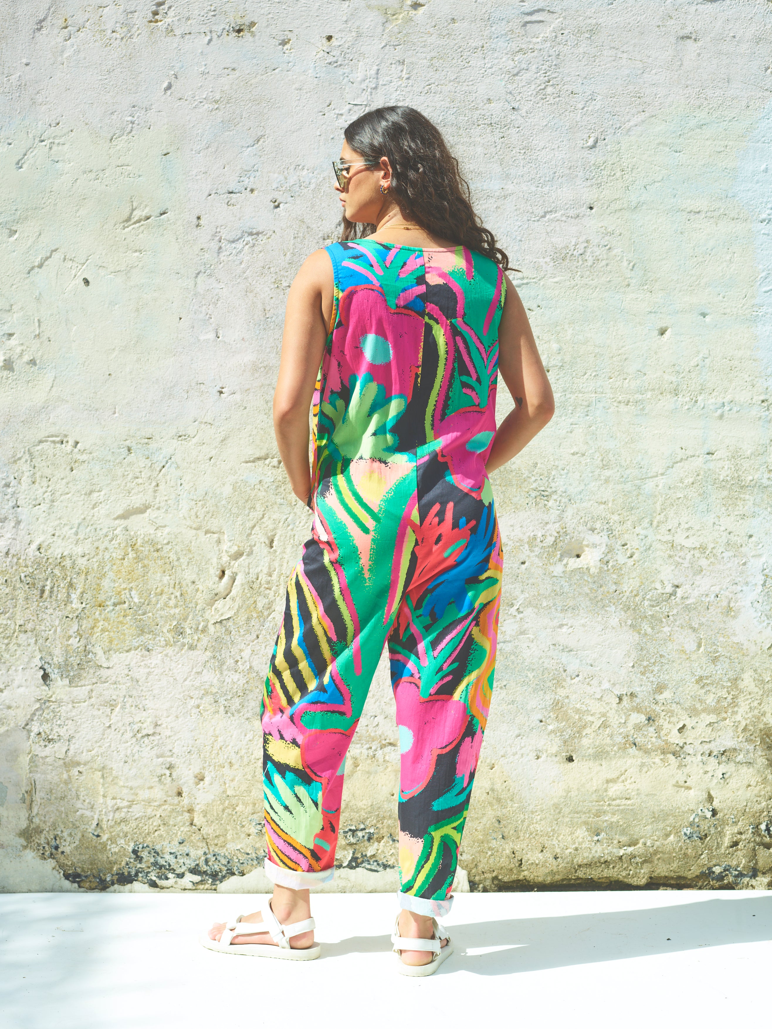 The Jungle Sunny Days Jumpsuit featuring a hand-drawn tropical design in bright and neon colours on a. black base, this design is one for the festivals. Pair with the Jungle Cropped Swing Jacket for a fun co-ord look.