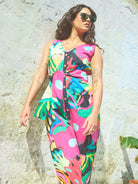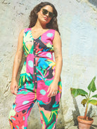 The Jungle Sunny Days Jumpsuit in a brand new print for this year's Spring/Summer, featuring a hand-drawn tropical design in bright and neon colours this design is one for the festivals. Pair with the Jungle Cropped Swing Jacket for a fun co-ord look.