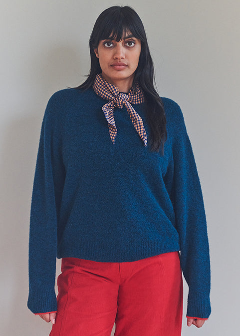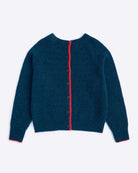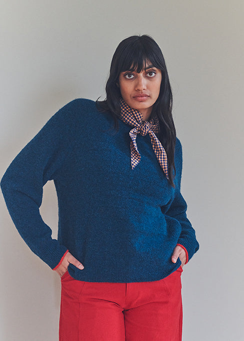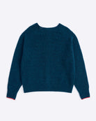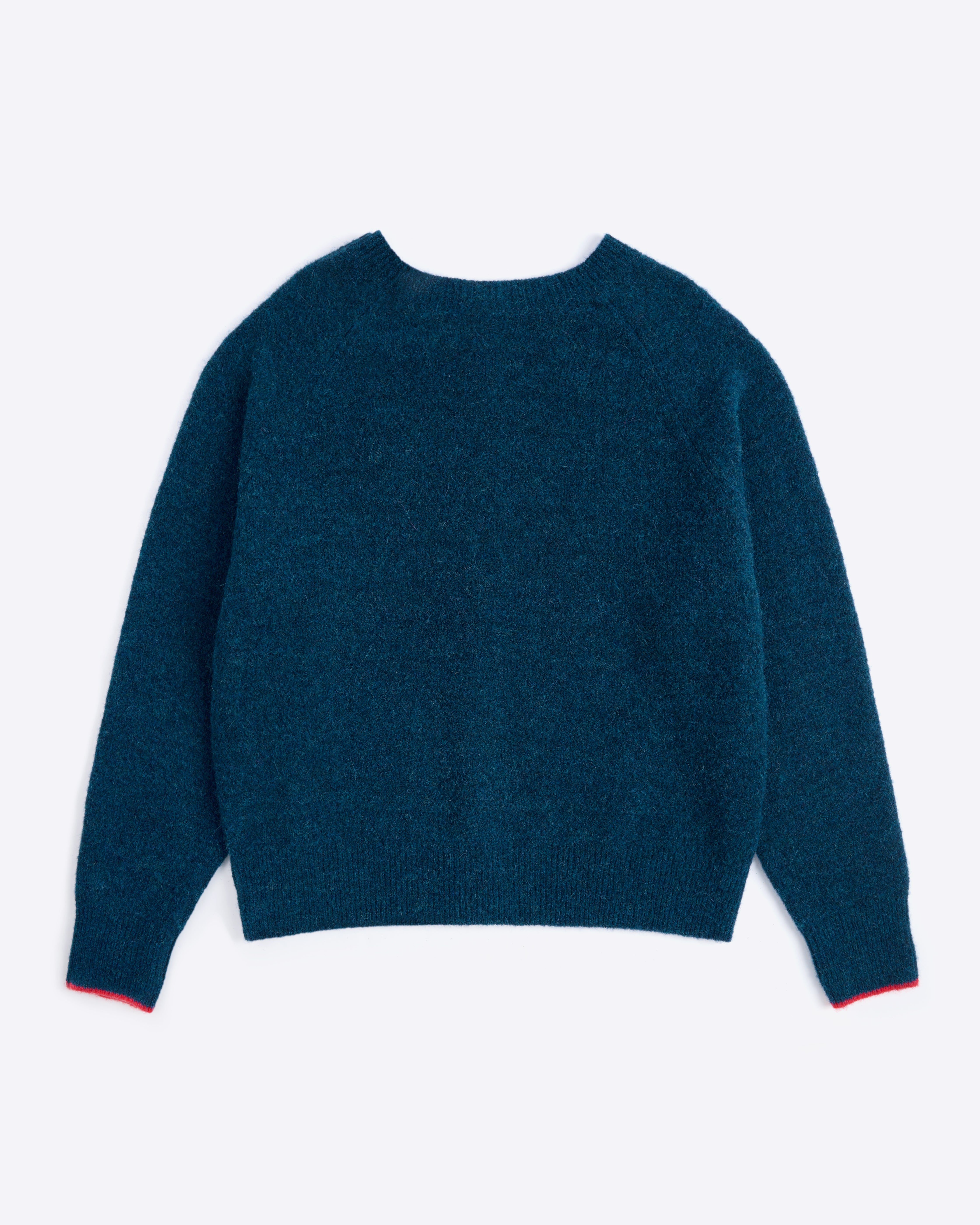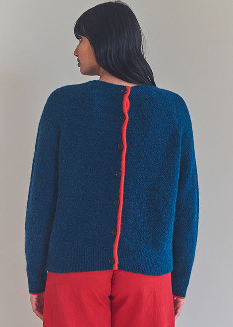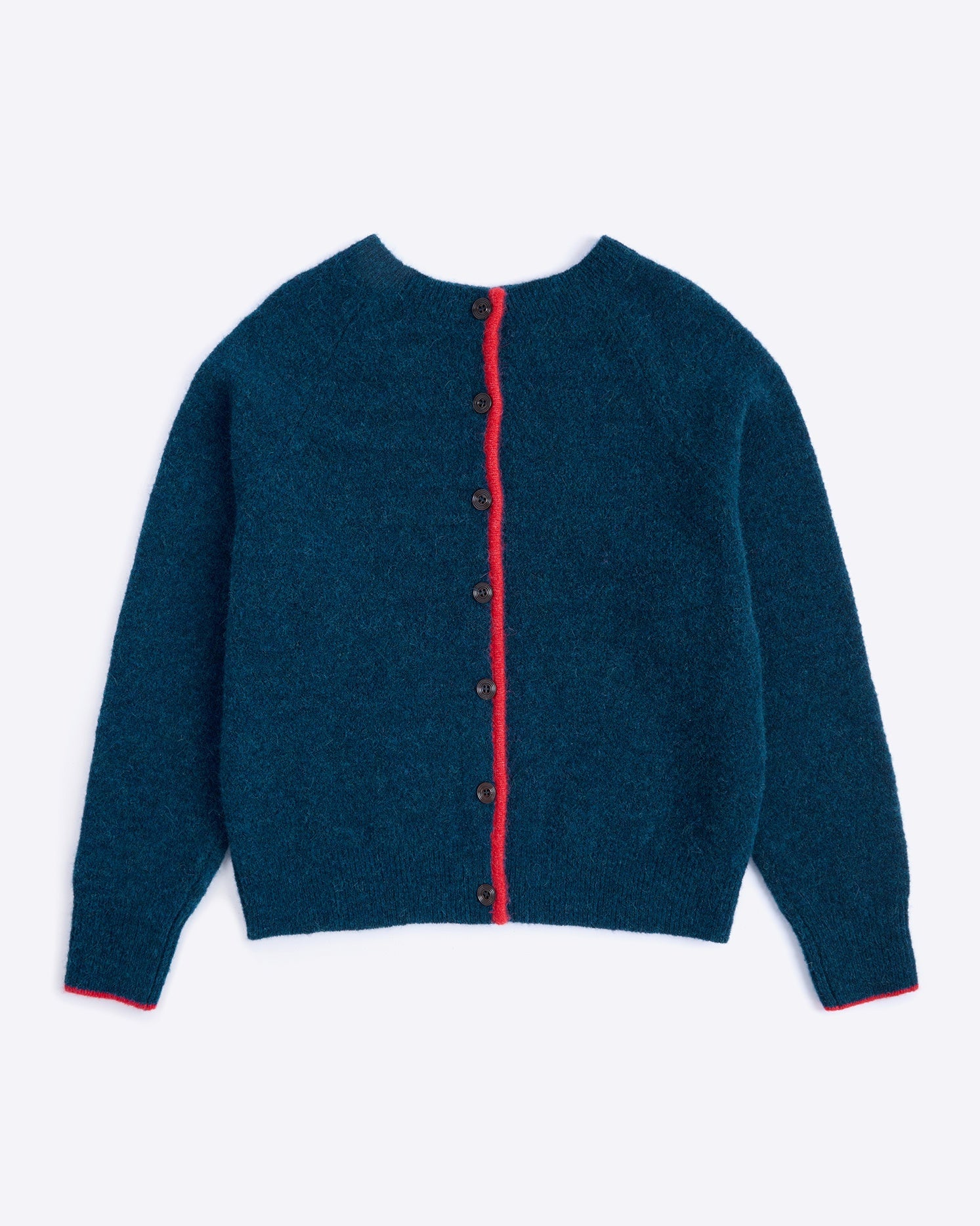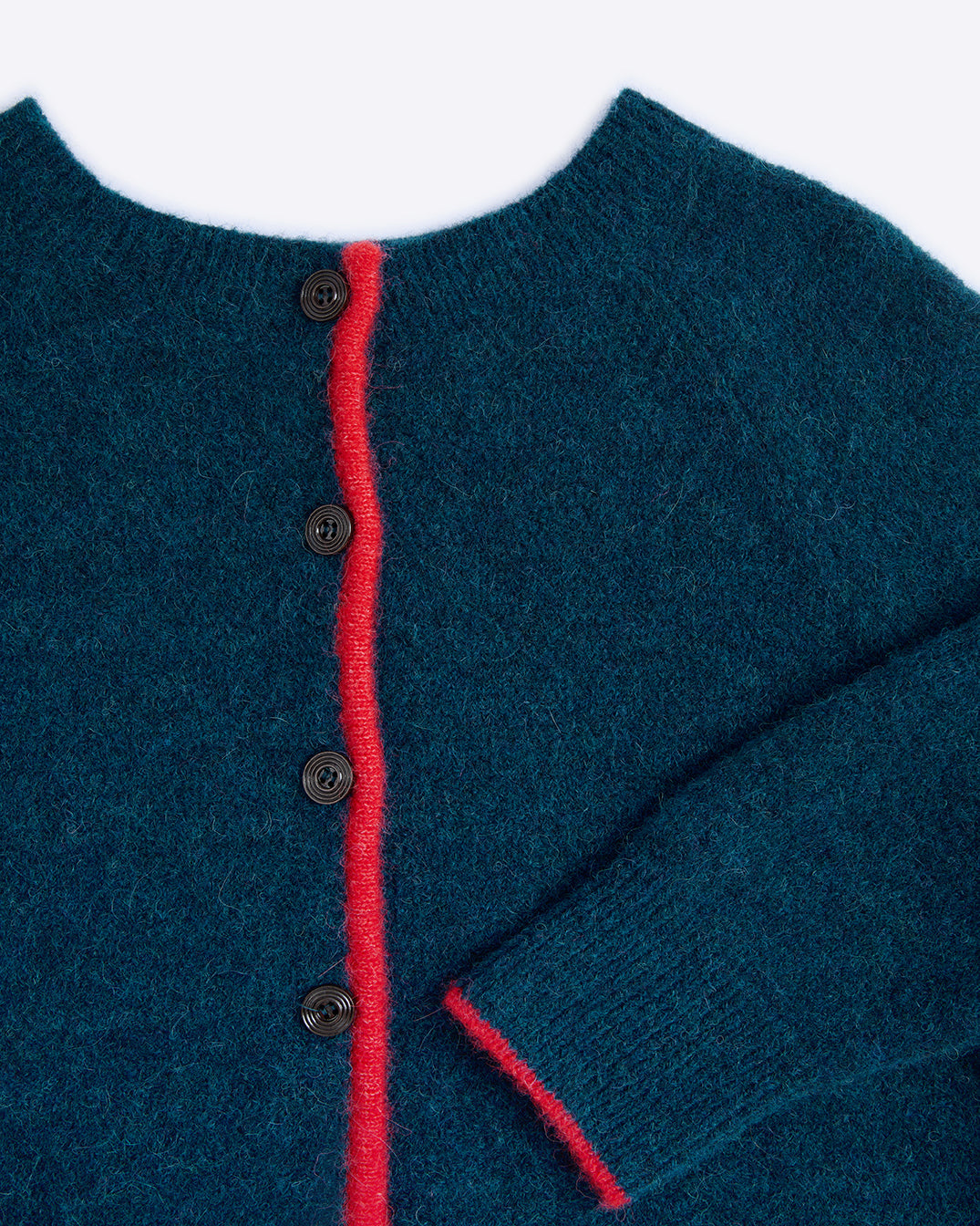 This petrol blue colour in heavenly soft alpaca yarn is knitted in our signature triangle pattern, tipped with bright red on the placket and cuffs and finished with ridged wooden buttons. A Lowie classic knit style re-designed in alpaca, our slouchy Jumpigan is breathable, comfortable, warm and indispensible.