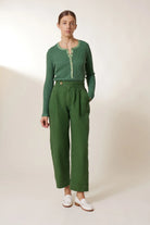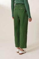 Button tab closure and pleated front pockets. Features an elastic waistband and straight fit with a slight taper
