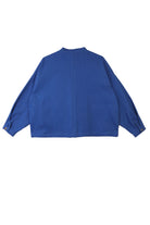 L F Markey's take on a classic chore coat with a wide boxy shape, voluminous sleeves and imitation horn buttons down the front. With side seam pockets, front patch pockets and a large removable cardboard label on the left pocket. In vibrant cobalt cotton drill with their signature sun and wave woven patch logos dotted throughout.