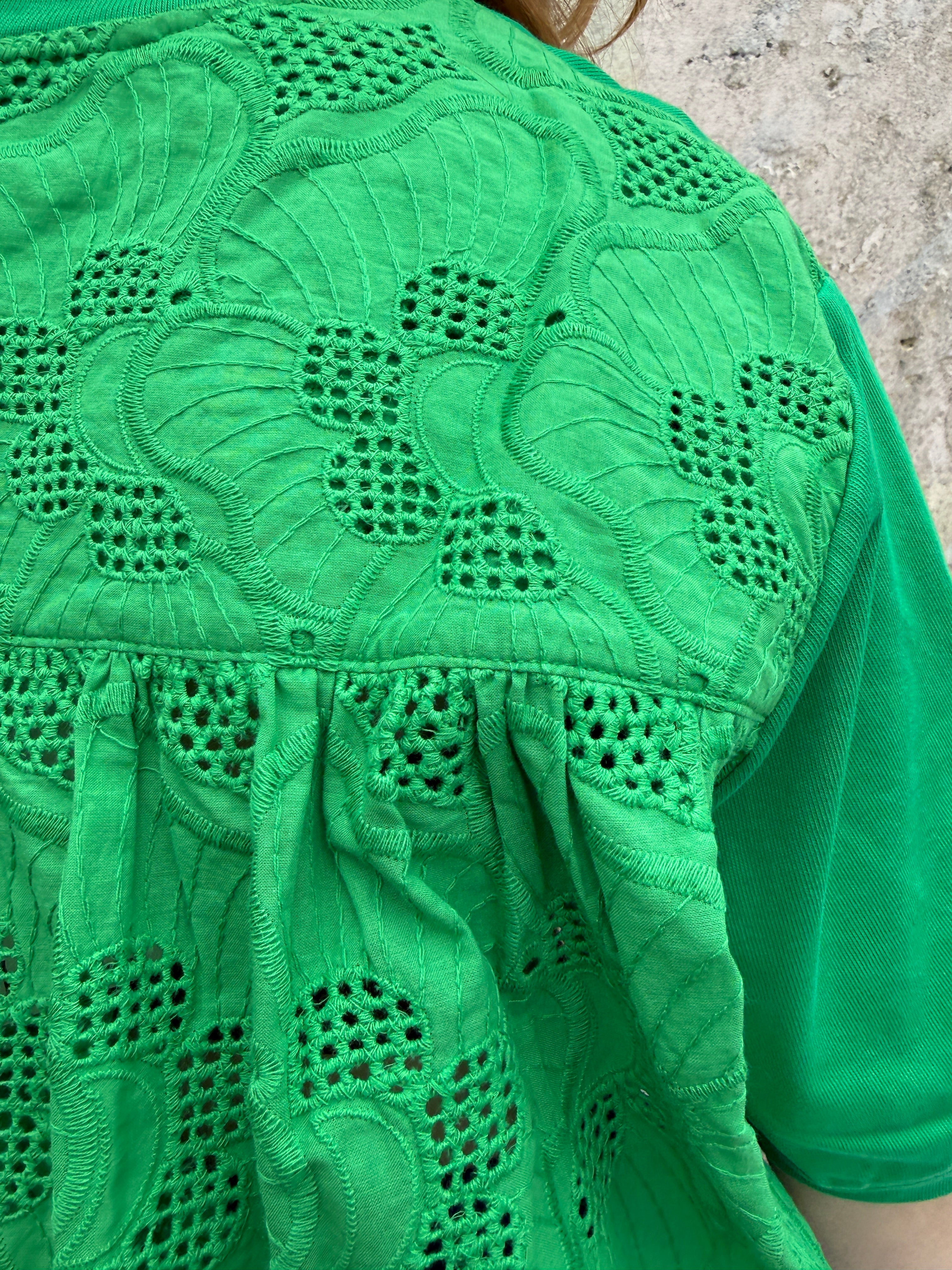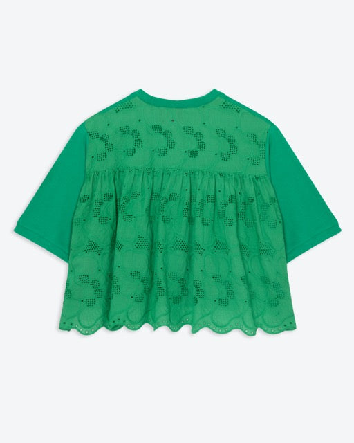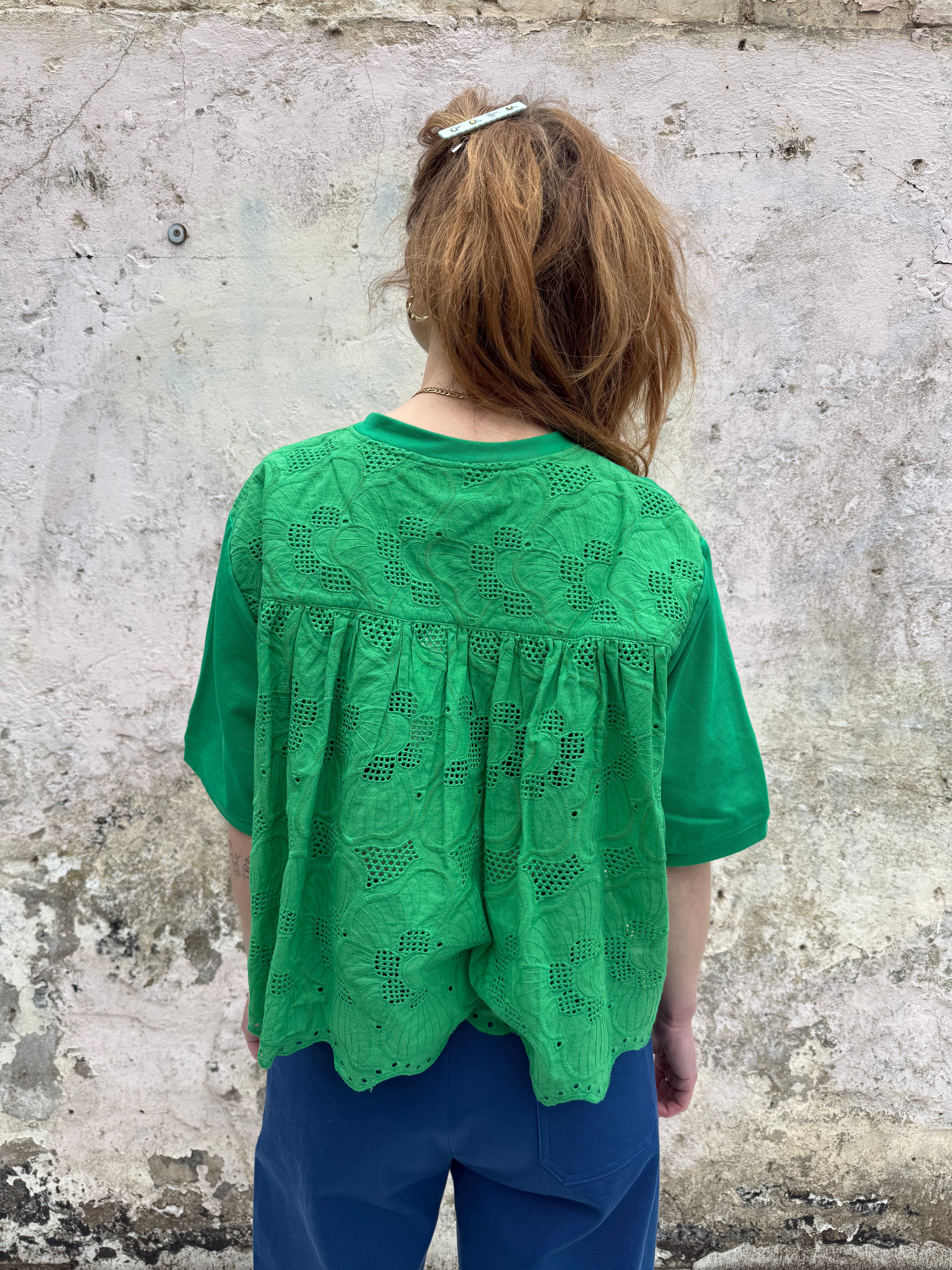 Our short-sleeve shirt is crafted from soft cotton jersey in a vibrant green. Designed with a relaxed, boxy fit, it features a classic crew neckline and an easy dropped shoulder for everyday comfort. The back reveals a beautiful broderie anglaise panel with delicate cutwork detailing, gently gathered for added movement and shape. A scalloped hem peeks out beneath the front, adding a playful, elevated twist to an everyday staple.