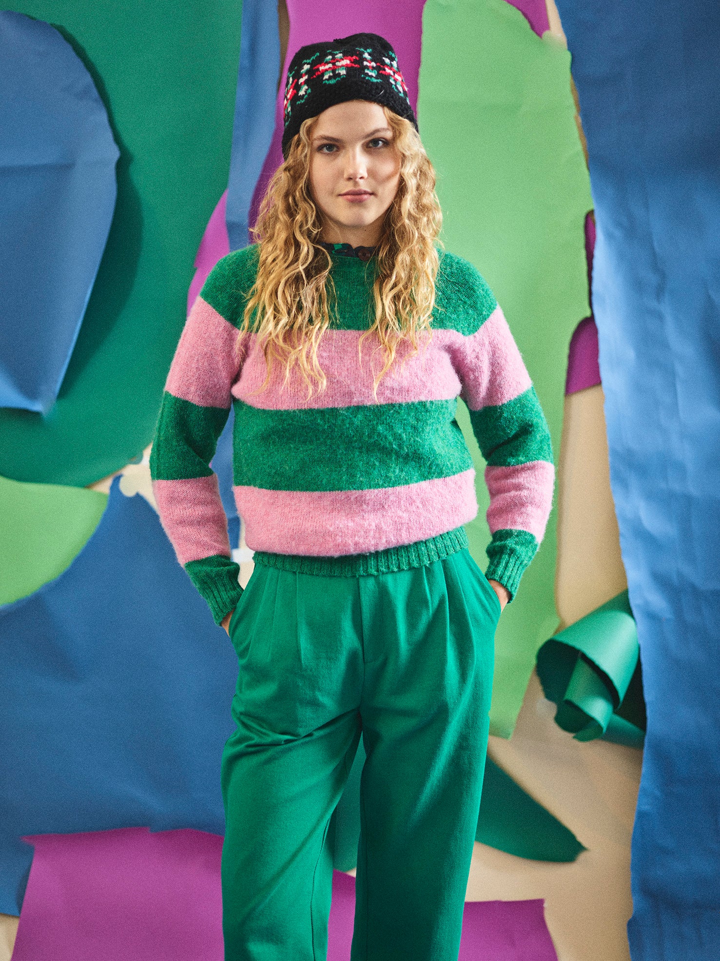 Knitted from 100% Scottish spun lamb’s wool with bold horizontal block colour design in mid pink and jade green. The knit is finished with cosy ribbed hemline and ribbed trim on round neck and cuff.