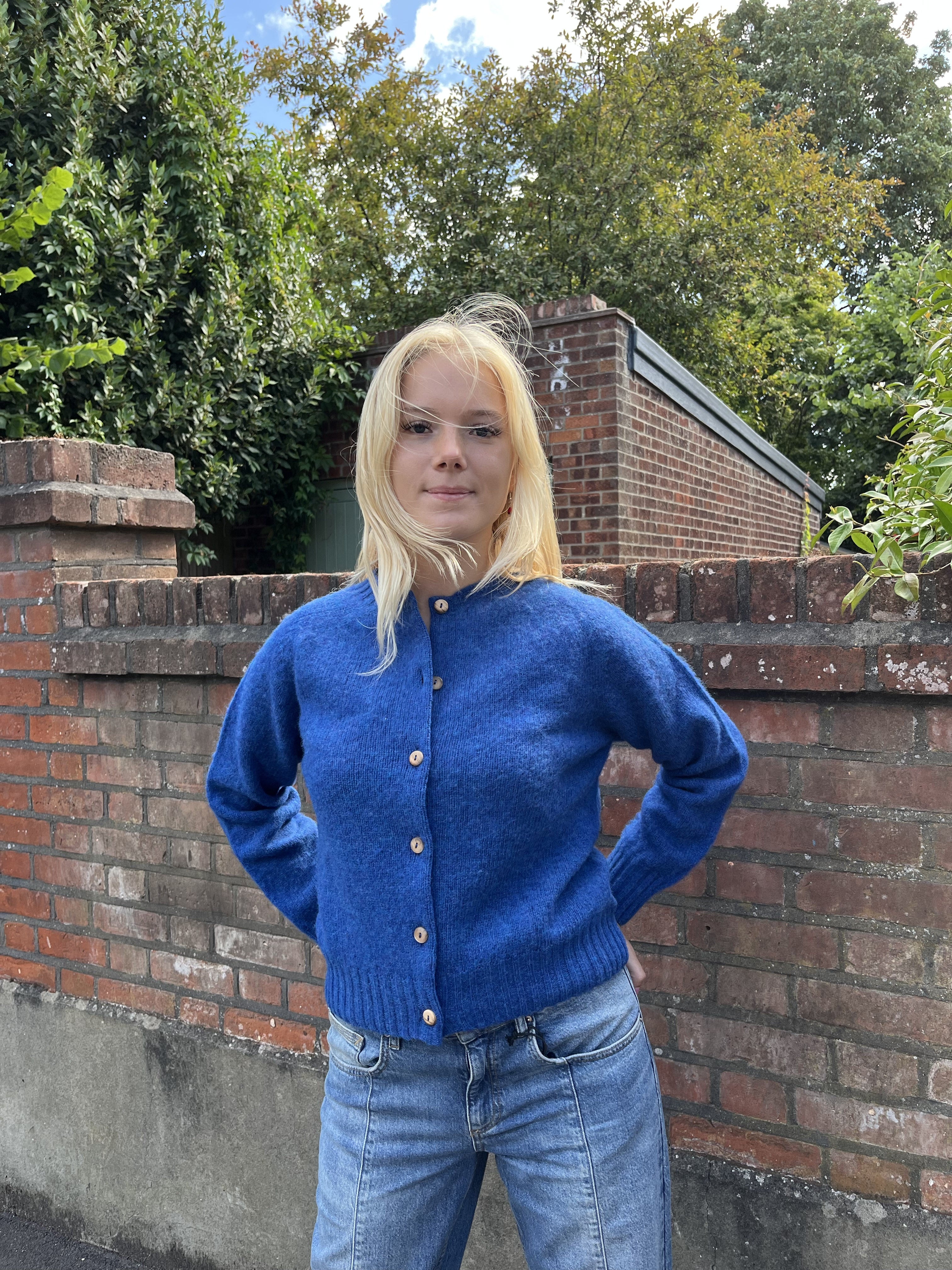A staple addition to our Scottish knitwear collection, the Lowie sapphire brushed boxy lambswool cardigan.