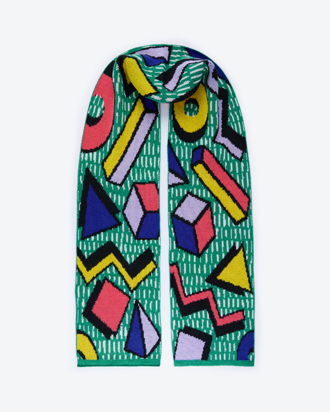 Wrap up in colour with the Tangent Wool Scarf – Large. Forest green meets bold geometric shapes in mustard, red, purple, and blue for a striking zig-zag design.