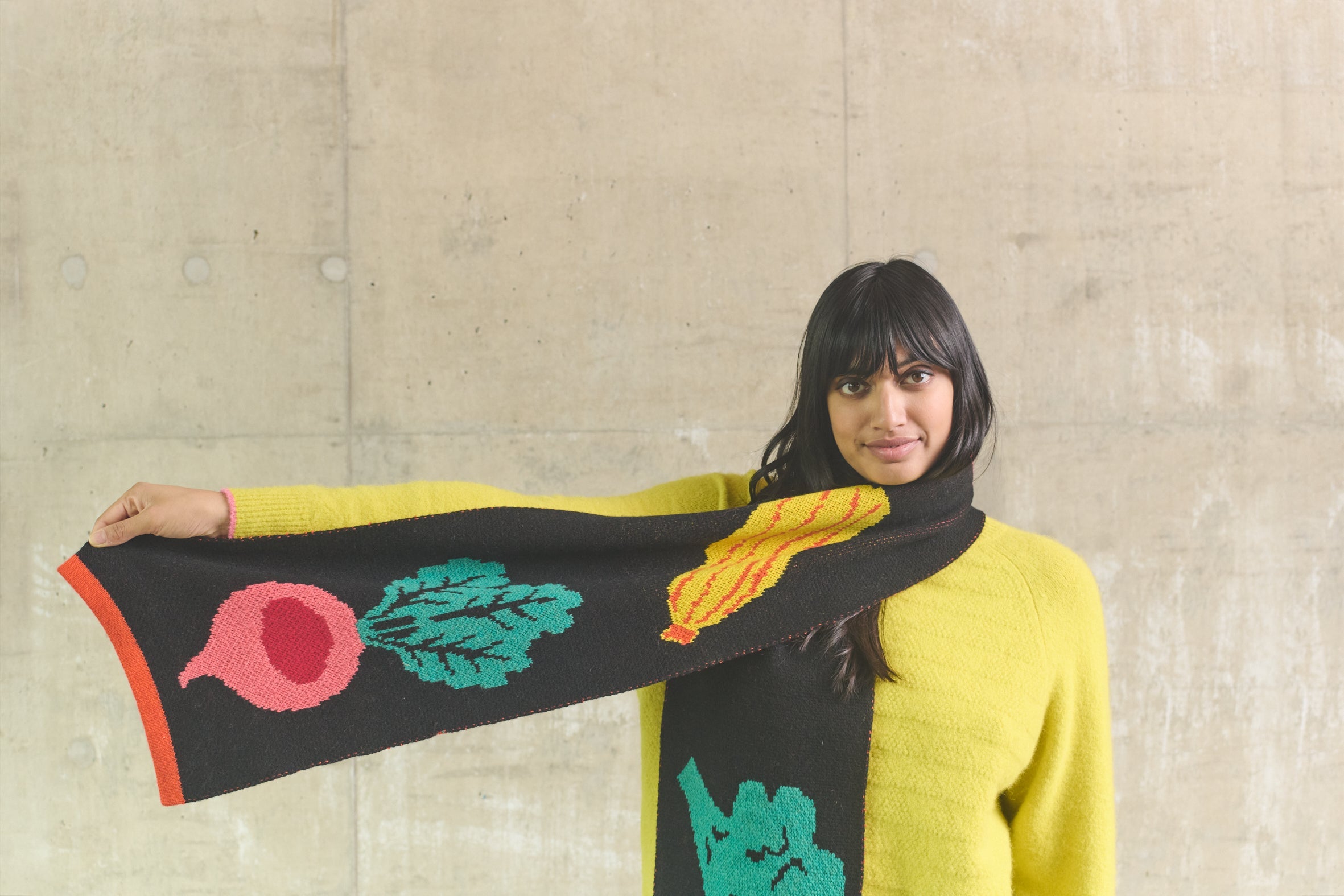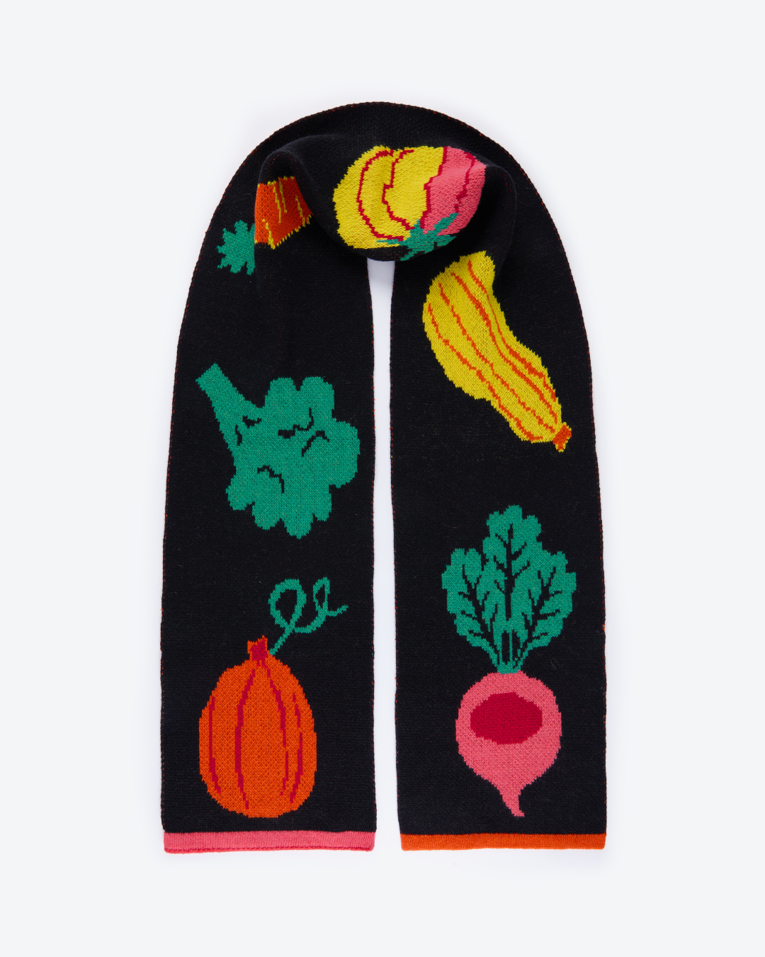 Add a playful twist to winter with the Vegetables Wool Scarf – Large. A black base showcases colourful veggies—pumpkin, beetroot, squash, and broccoli—in bold pops of green, orange, pink, and yellow.