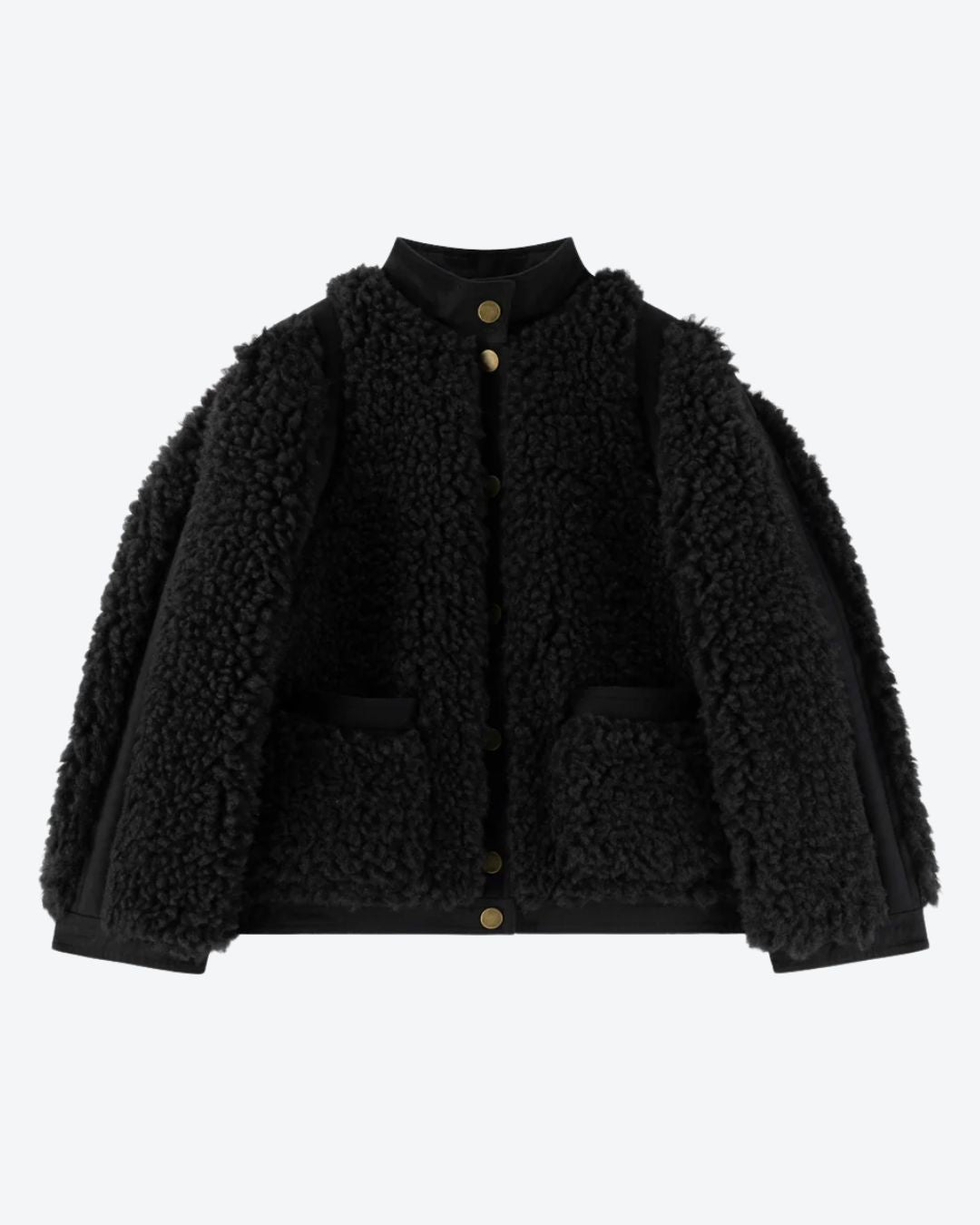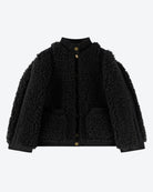 FEATURES: Boucle texture, Loose volume, Cropped cut, High collar with button placket, Round buttons at the front, Two patch pockets, Puff sleeves, smooth panels