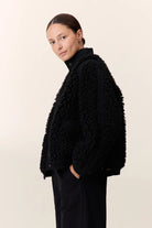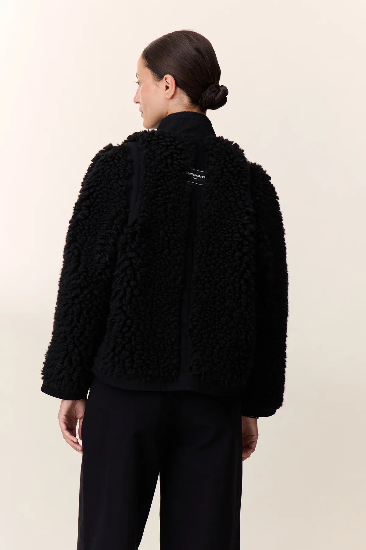 The Vyvian PLN coat expresses the Leon & Harper spirit with its boucle texture and bold volume. The cropped, loose fit creates a modern look. The high collar warms the silhouette and fastens with a precise button placket. The round buttons and two large patch pockets define the style. Smooth fabric panels on the shoulders, along the sleeves' sides, and down the back add rhythm to the design for a contemporary contrast.