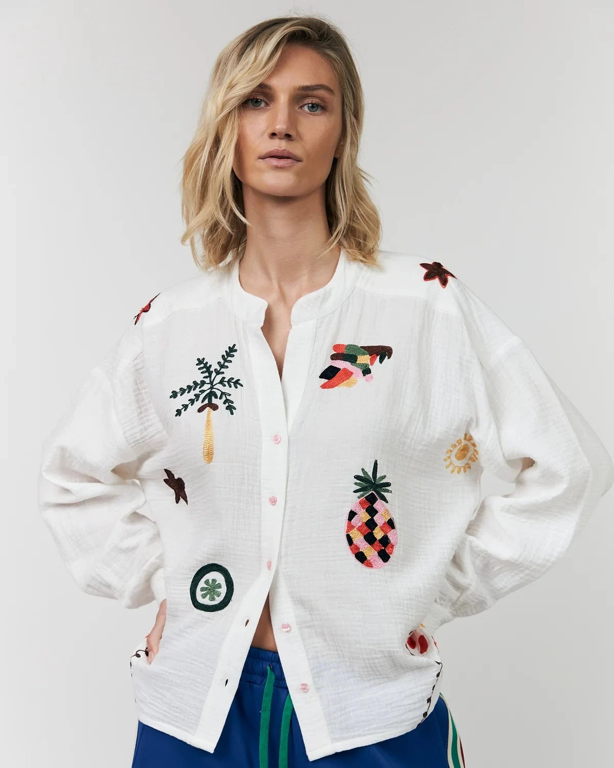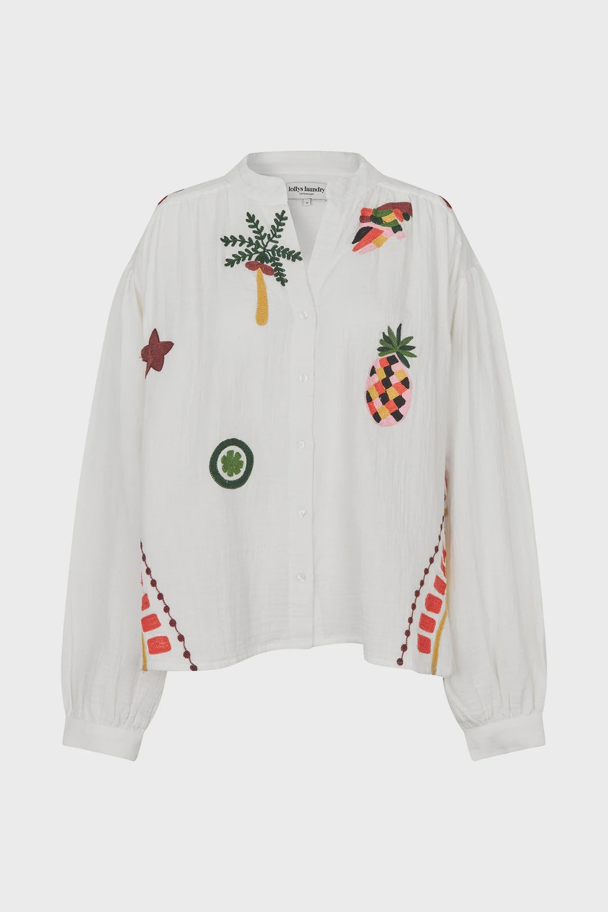 FEATURES: Soft woven cotton with subtle texture, colourful embroidered detailing throughout, small stand collar with relaxed V neckline, button front closure, long sleeves with cuffs, loose comfortable fit