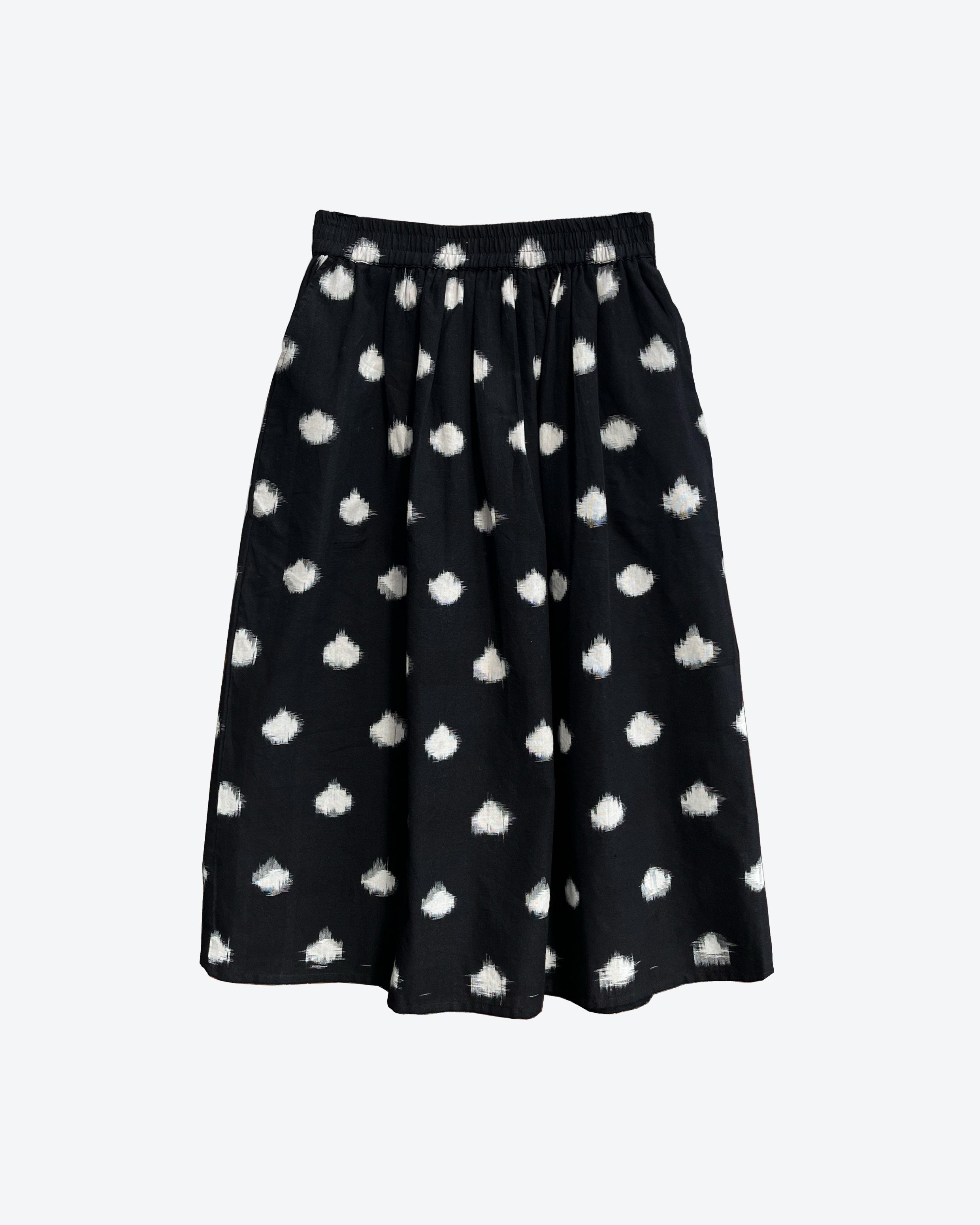The easy pull on skirt in handwoven Ikat khadi cotton. Sitting at low calf length this simple skirt has side pockets and a fully elasticated waist. The handwoven ikat has a bold spot design all over.