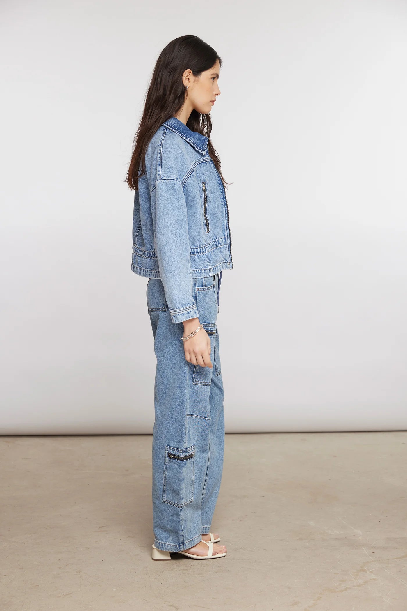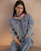 A versatile cropped denim jacket designed for easy spring layering. Finished with an adjustable internal waist cord and a reversible or removable collar, it offers multiple styling options while keeping a clean, modern silhouette.