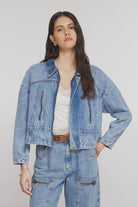 FEATURES: Cropped fit, reversible and removable collar, internal drawcord for adjustable waist, zip pockets, soft feel, midweight denim