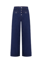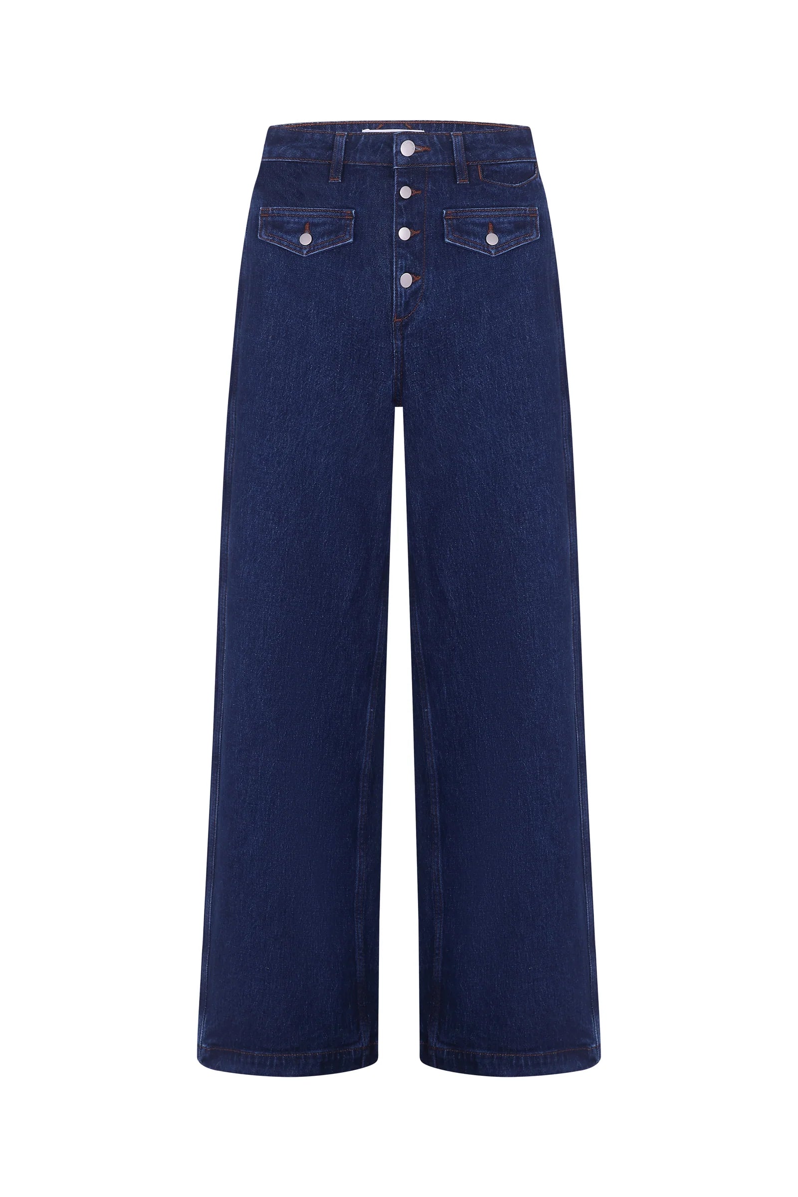 FEATURES: Wide leg, mid-rise, retro flap pockets, exposed fly buttons, soft hand feel, flexible midweight fabric