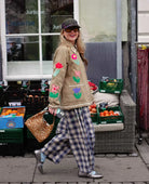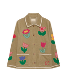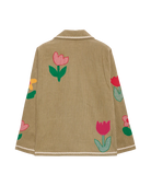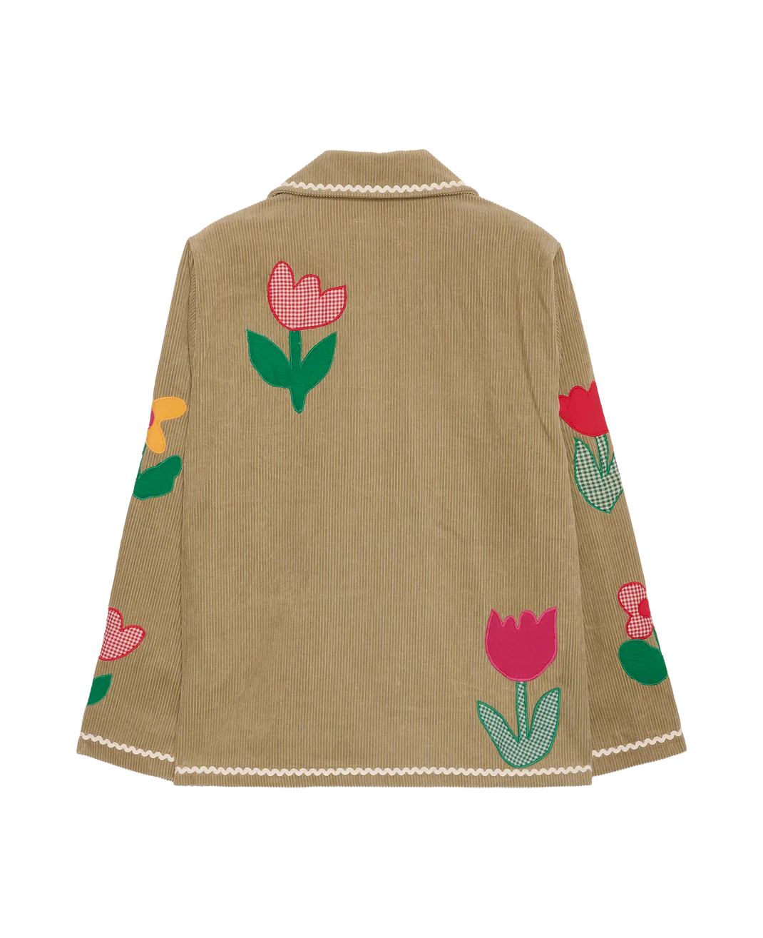 The Twiggy Jacket is a relaxed corduroy jacket crafted from leftover cotton fabrics, giving each piece a limited-edition feel. Designed with a casual silhouette, it features a small shirt collar, button front and practical front pockets. Appliqué tulip flowers made from yarn-dyed checks and solid cotton fabrics add a playful touch, finished with contrasting zig-zag tape for extra detail. Made using deadstock fabrics, this jacket reflects a thoughtful approach to creating unique, more responsible fashion.
