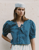 FEATURES: Relaxed fit, short sleeves, statement sailor collar, tie-front fastening, vertical stripe pattern, lightweight fabric