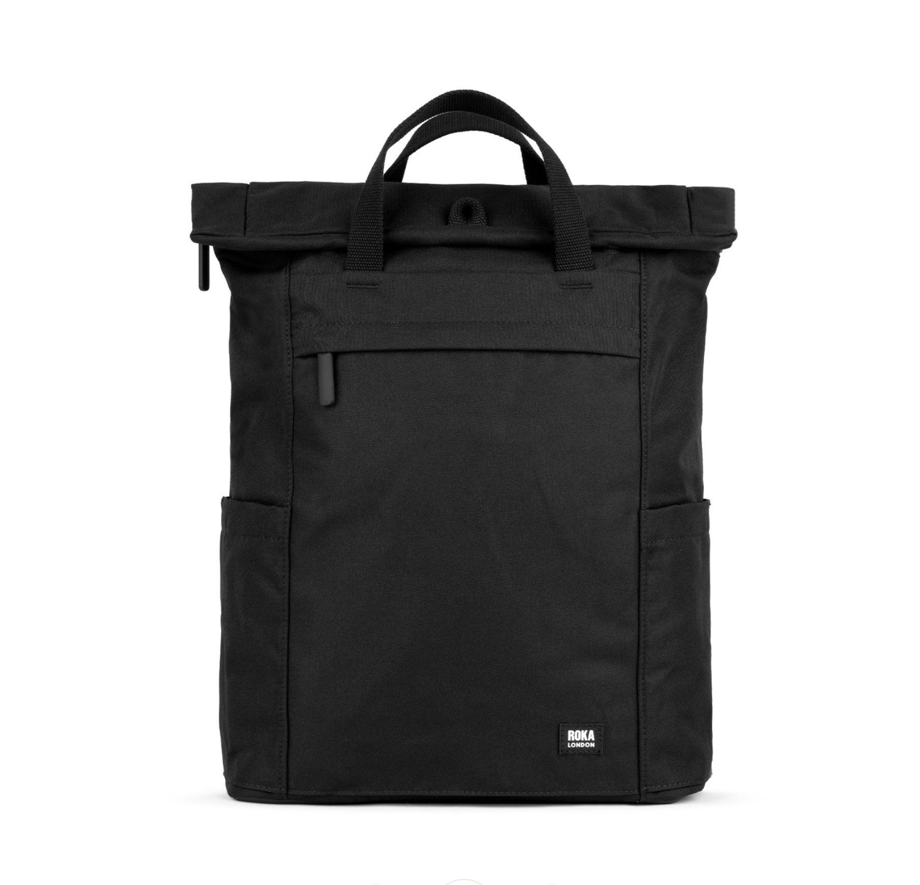 Weather-resistant rucksack by Roka London. With ample storage space the Finchley has a padded laptop or tablet sleeve and loads of pockets. Made using recycled Canvas made from plastic waste and coated to make it water-resistant, the canvas material is weather-resistant, lightweight, and durable.