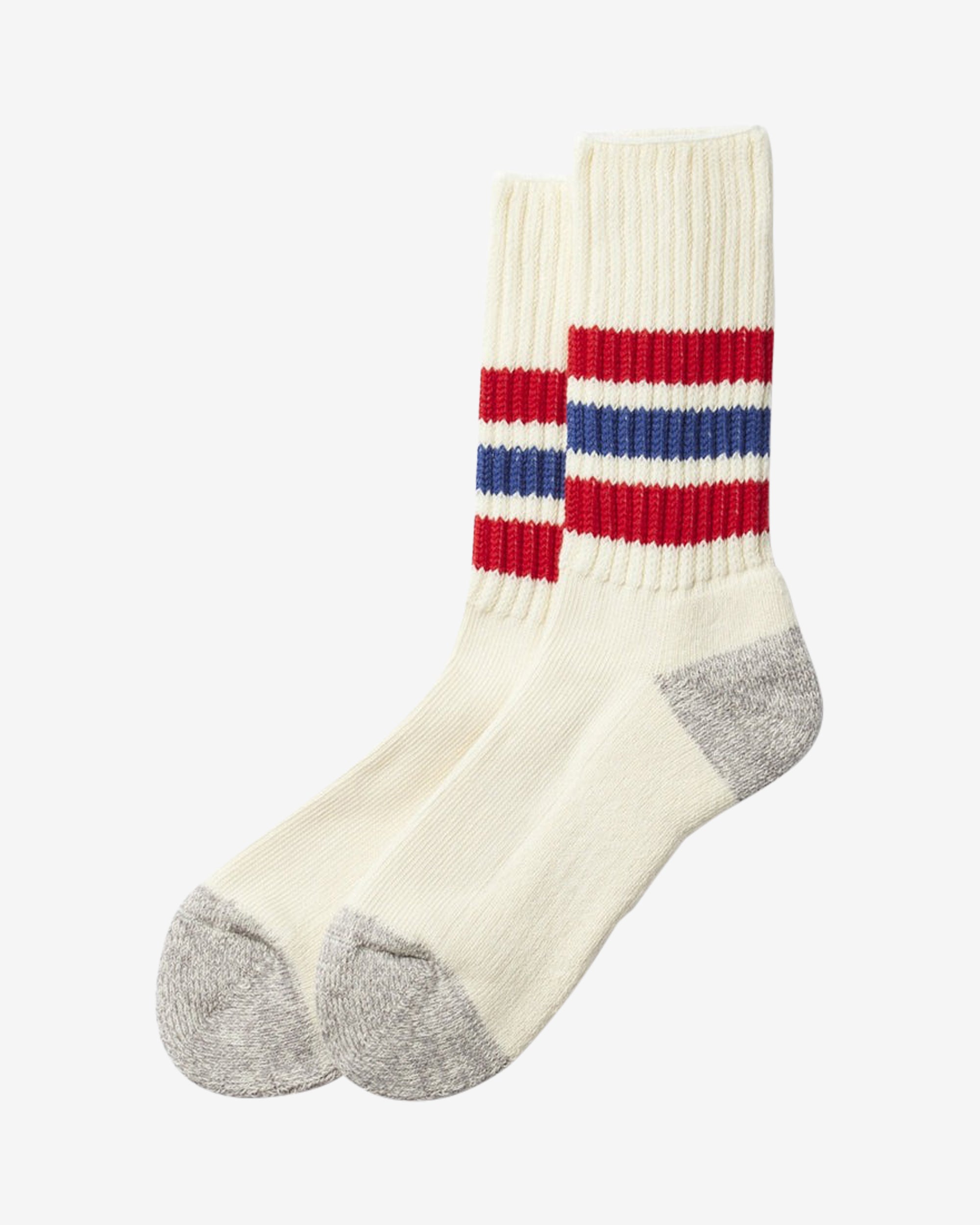 The Rototo Coarse Ribbed Old School Crew Socks in Chili Red/Blue are based on tube socks that were made in the U.S in the late 70s.