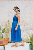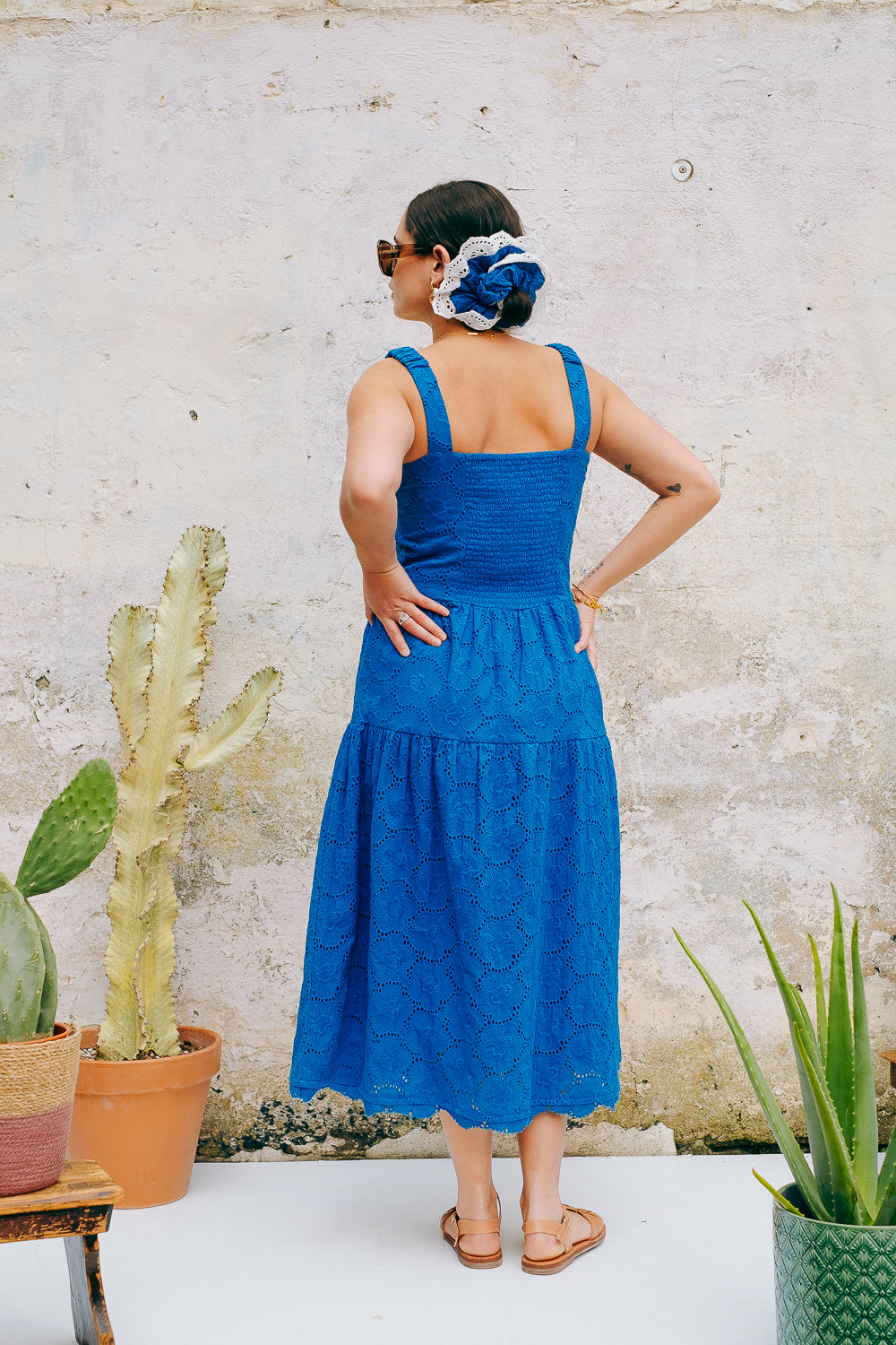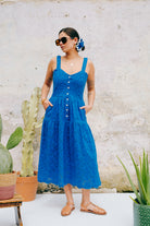 The Josephine Dress is made of a floral broderie anglais in 100% cotton. The bold cobalt blue takes this feminine summer dress to the next level. The dress has buttons down the front and elasticated shirring at the back to really hug the bodice. The skirt and bodice are fully lined with broderie detailing on the hem, wide straps and side pockets.