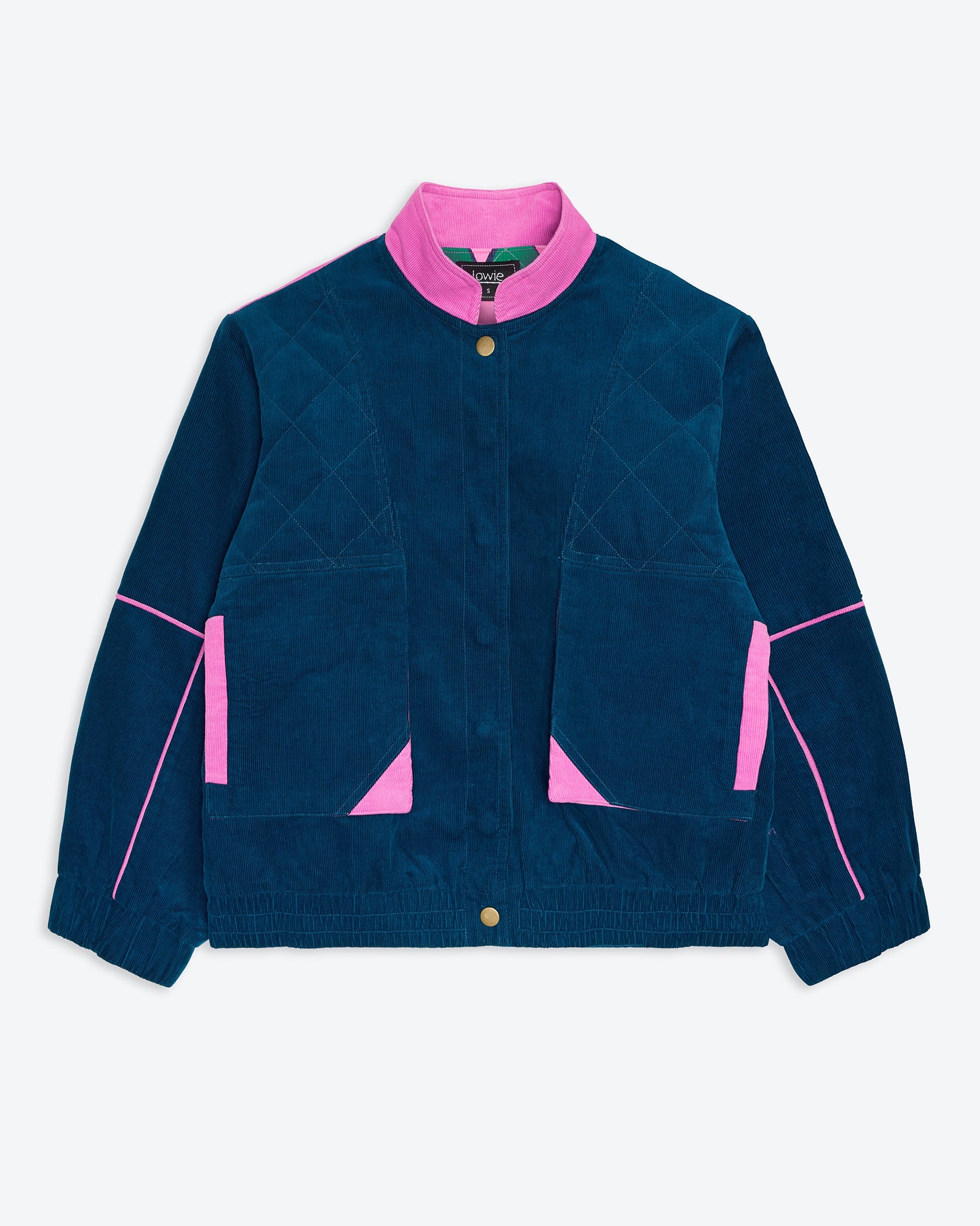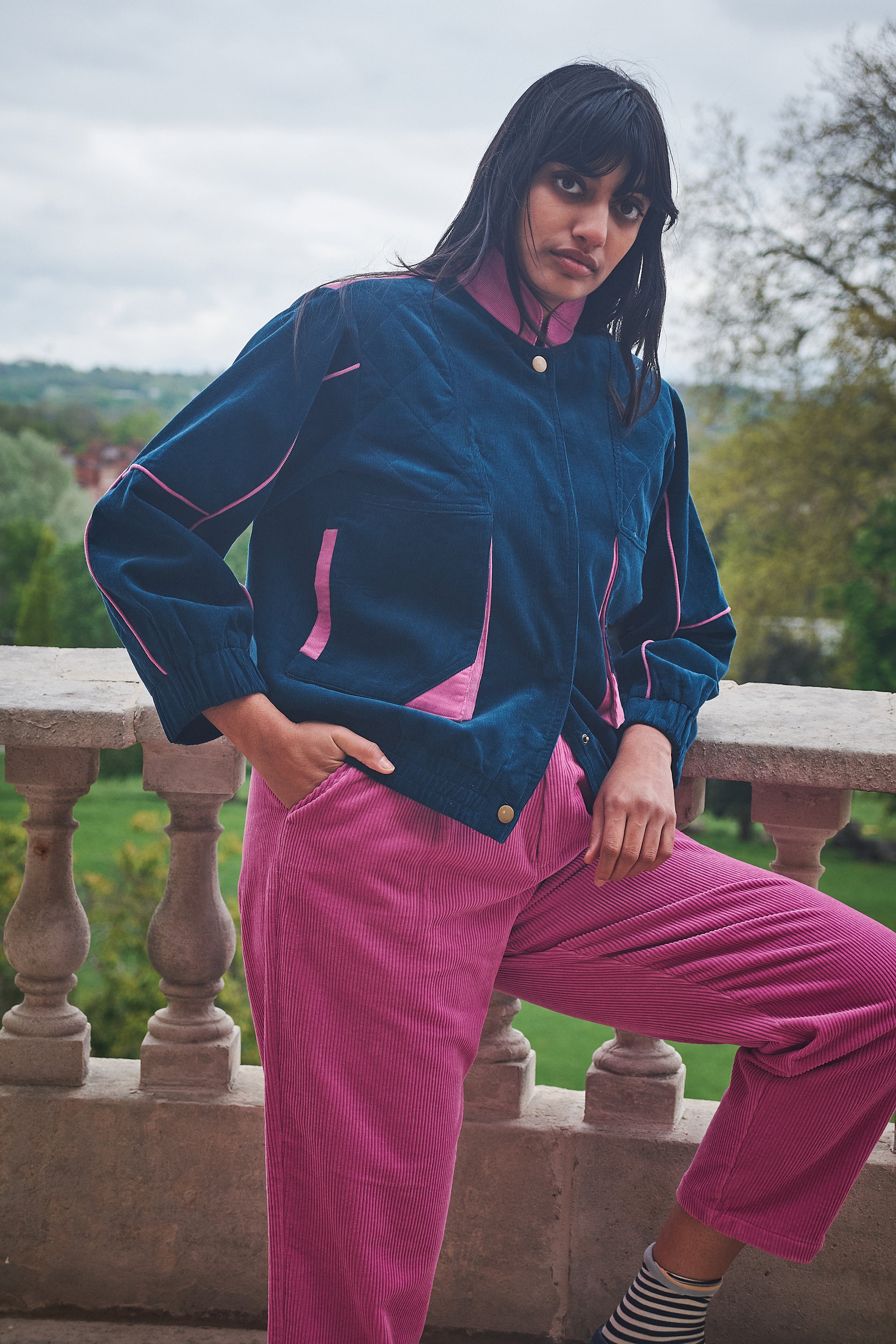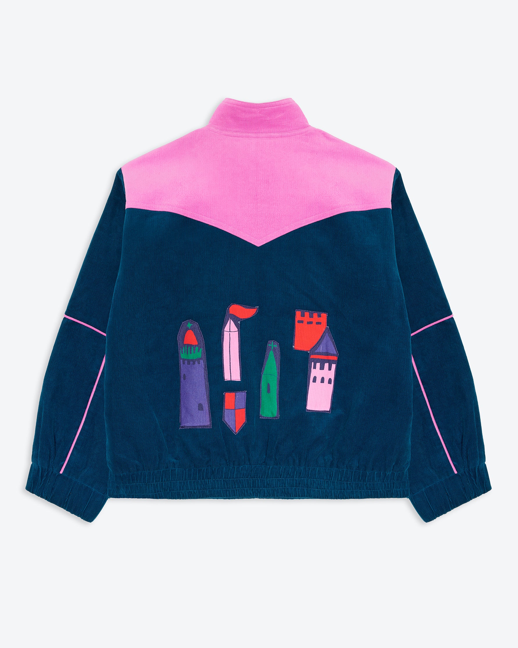 Our needlecord castle jacket is a true original. Using pink and navy needlecord, the bomber jacket has ample pocket space, elasticated cuffs and hem. The back of the jacket is covered in applique patches of colourful handdrawn castles. Quilted inside this jacket is not just for show and will keep you warm and will fit a knit underneath.