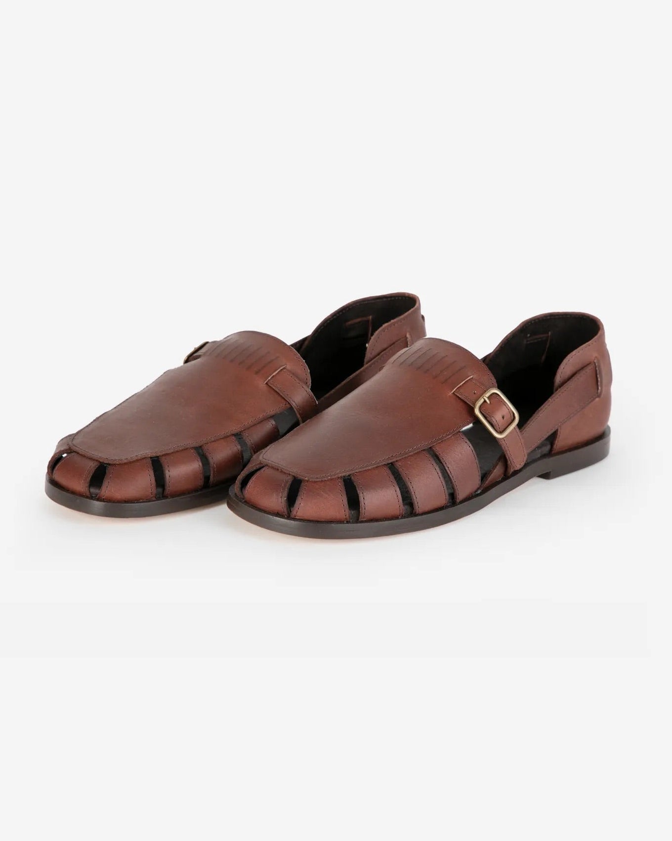 A classic leather sandal from Bobo Choses, made in Spain from smooth dark brown leather. Designed with a closed, woven-style front for coverage and breathability, and finished with an adjustable buckle strap for a secure fit. A sturdy sole makes them suitable for everyday wear through warmer months.